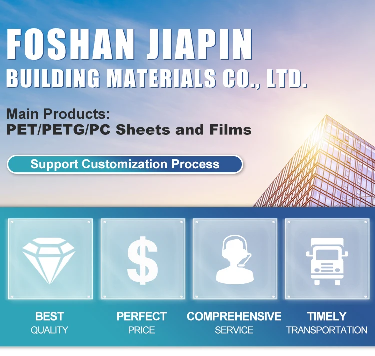 Foshan Jiapin Building Materials Co., Ltd. was established in 2013, which has more than 10 years of experience in R&D, production and sales. Our main products are PET(polyethylene terephthalate )sheet,PC(polycarbonate) sheet, PETG plastic sheet, hollow sheet, APET sheet, plastic plate and sheet materials. We have an amount of 4 International advanced production lines and our raw materials are mainly imported.