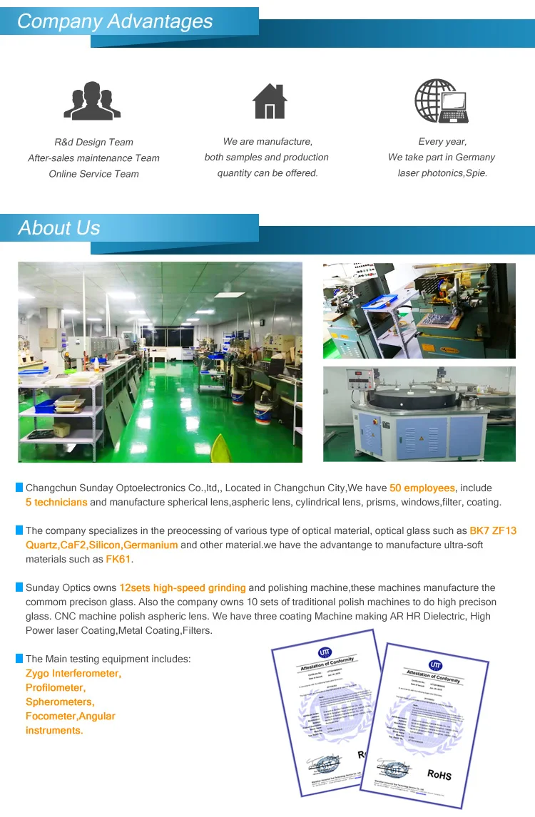 Main materials: optical glass, infrared materials, BK7 FK61 CaF2 Silicon Germanium, etc.