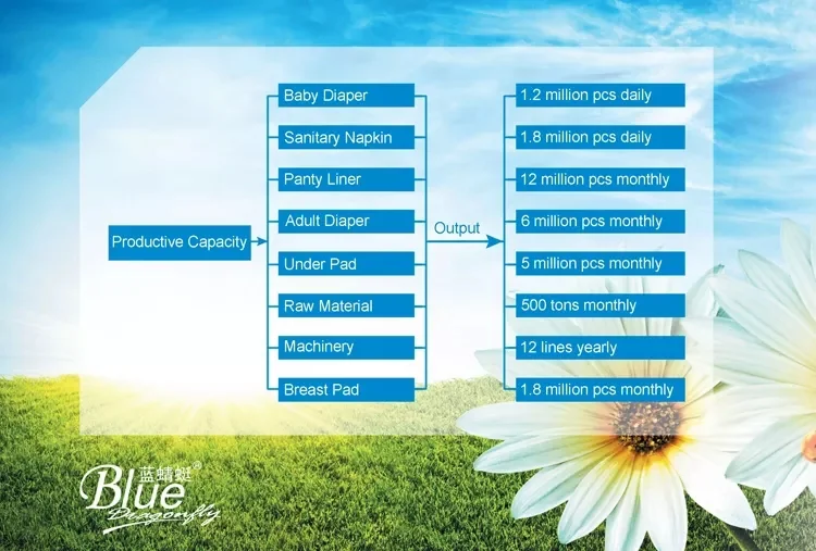 FUJIAN BBC INC. specialized in manufacturing and exporting of baby diapers & pants, adult diapers&pants, sanitary napkins, panty liner, under pads,breast pads,pet diapers&pads, face mask ,hygiene products raw material and machinery since 2003.