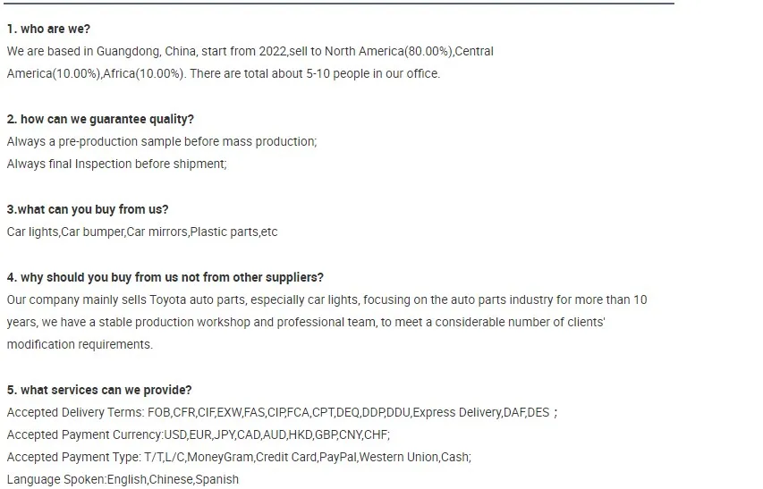 UNION STAR COMPANY LIMITED is a trading company, established in 1976, located in Taiwan Taipei. The company's products are export business of auto parts and car accessories, mainly to the Middle East countries. In addition to providing customers with professional FCL export services. The chairman adheres to the business philosophy of "integrity", and finds various products with high quality and competitive prices that meet customer requirement We will continue to maximize customer satisfaction. We will, as always, provide customers with better products and satisfactory services. In the future, we hope to be a trusted partner in the hearts of customers and create a win-win business plan with each other