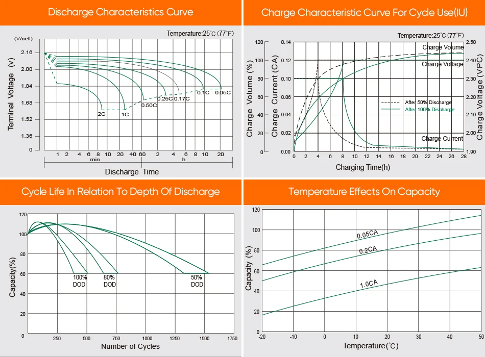 Float Charging Voltage | 13.6 V~13.8 V @ 25°℃ Temperature Compensation: -20mV/°C/Cell | ||||||