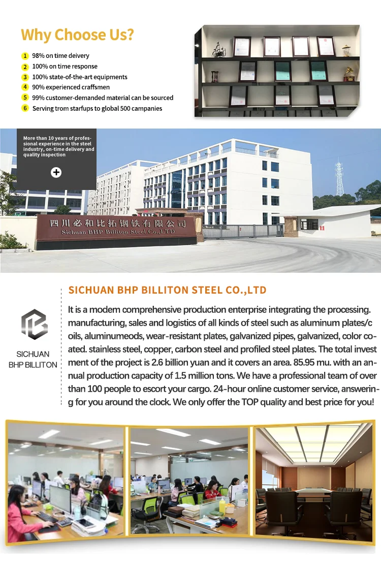 The Foreign Trade Department of Sichuan BHP Billiton Steel Co.,LTD is founded in 2017, the company has set up foreign trade departments and own warehouses in Sichuan and Shandong provinces. Some materials can be provided with spot stock to ensure delivery quality and timeliness. Our raw materials are from Southwest Aluminum, Shou Aluminum, Rizhao Iron and Steel, Tianjin Iron and Steel Group, Metallurgical Steel Group, Baosteel Group, Baosteel Group, Anshan Steel Group and other large steel mills.