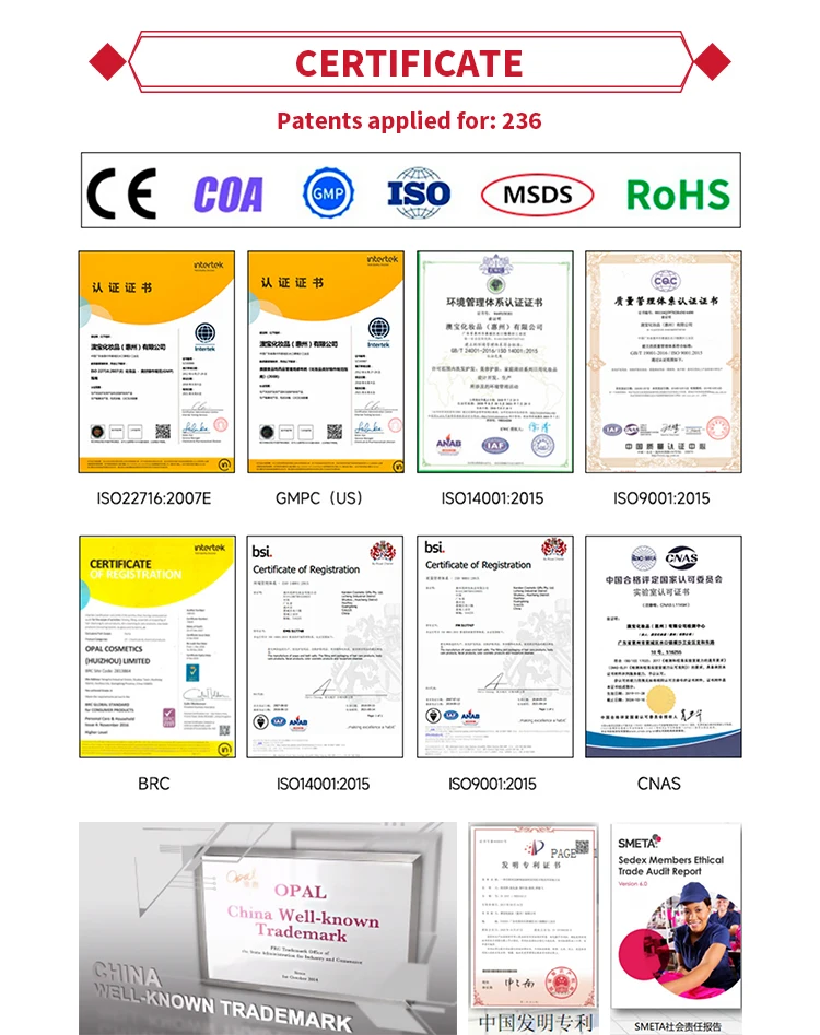 Q : Does your product have any certificate authorized by authorities ? A : GMPC, ISO14001 : 2015,ISO22716 : 2007(E),BRC ,ISO9001:2015,ISO 14001,SMETA, 136 REGISTERED PATENTS. etc. |