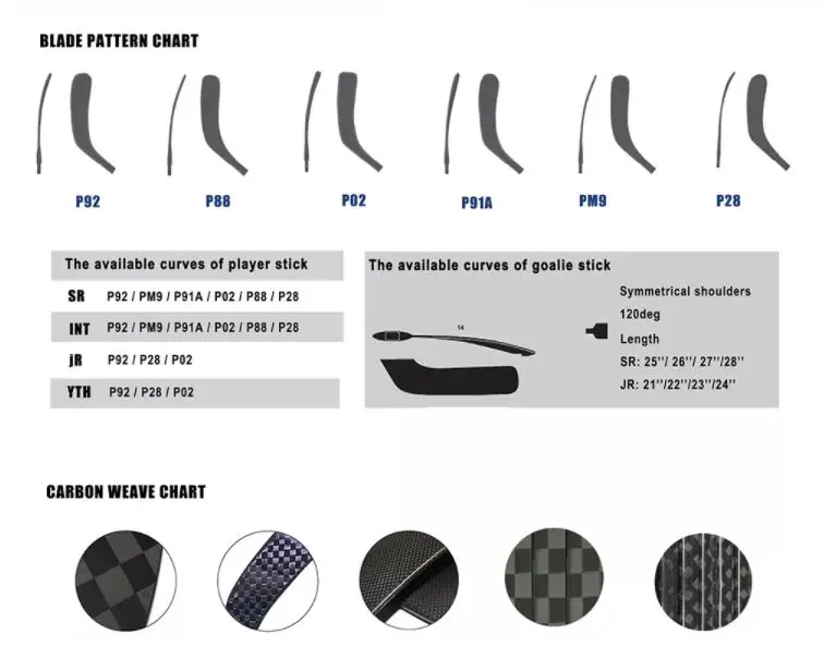 Blade ( Curve): | SR: P92,P88,P28,P91A,PM9,P02 (custom blade mold available) INT: P92,P88,P28,P91A,PM9,P02 JR: P92,P28 YTH: P92,P28. |