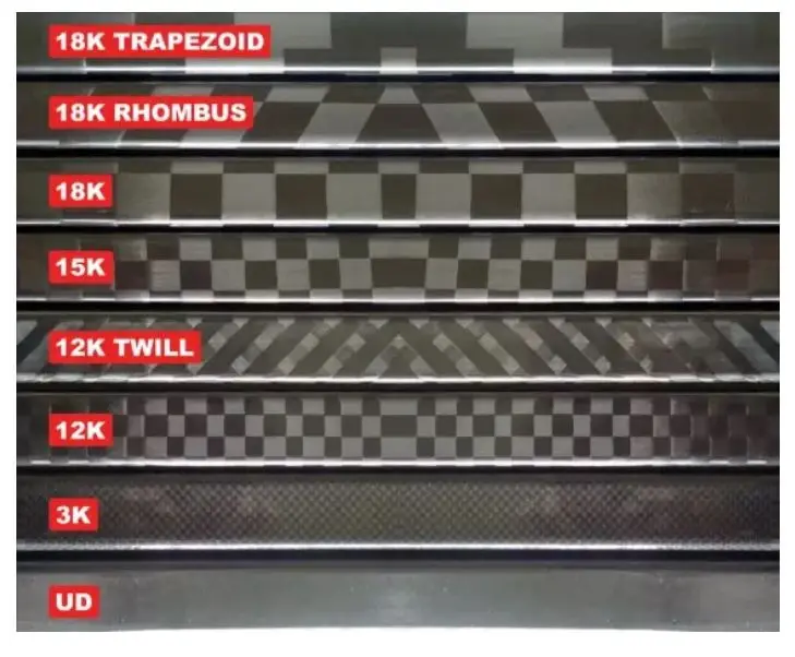 Carbon weave: | UD, 3k, 3k twill, 12k, 12k twill, 15k, 18k, 24k |