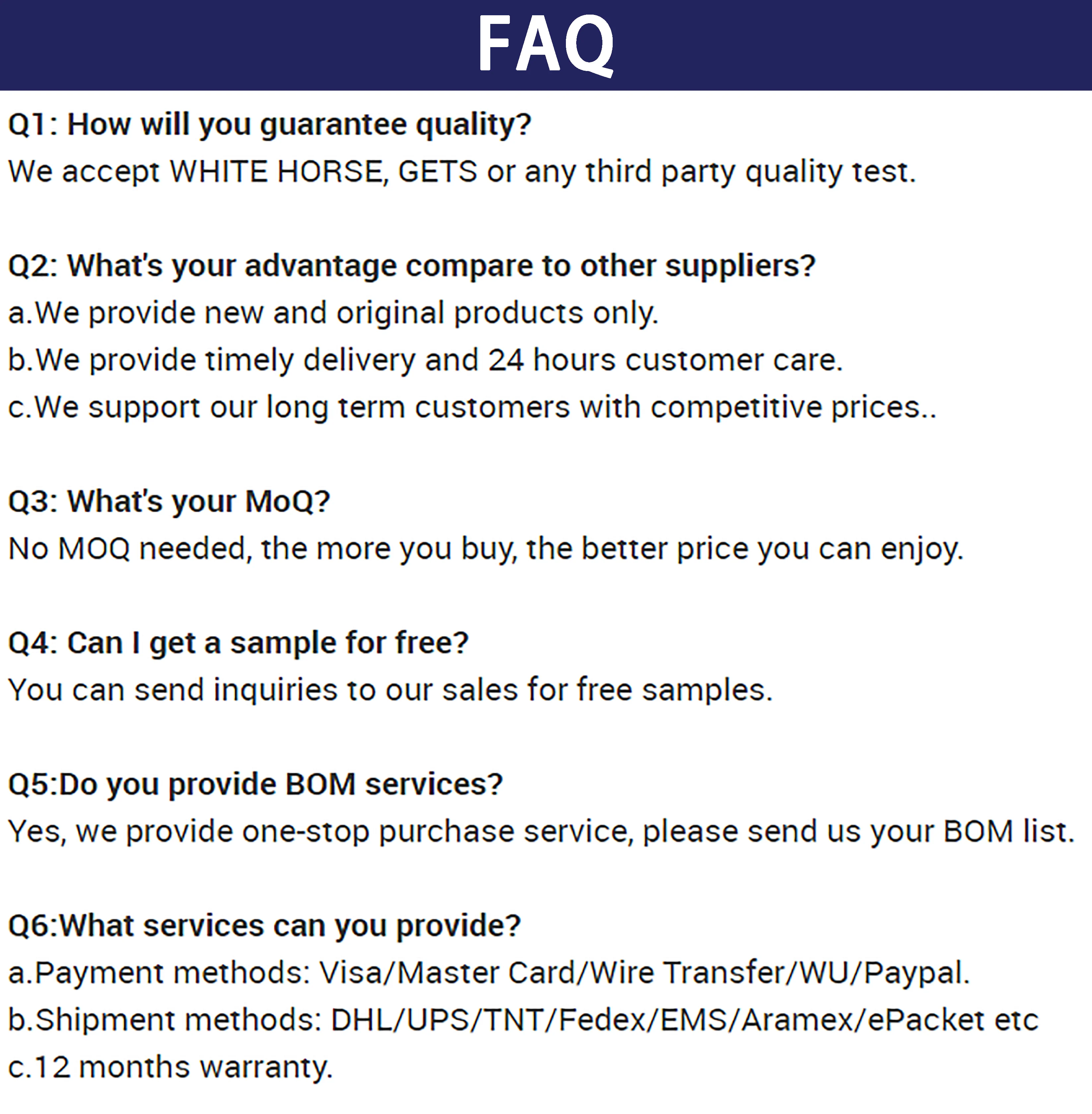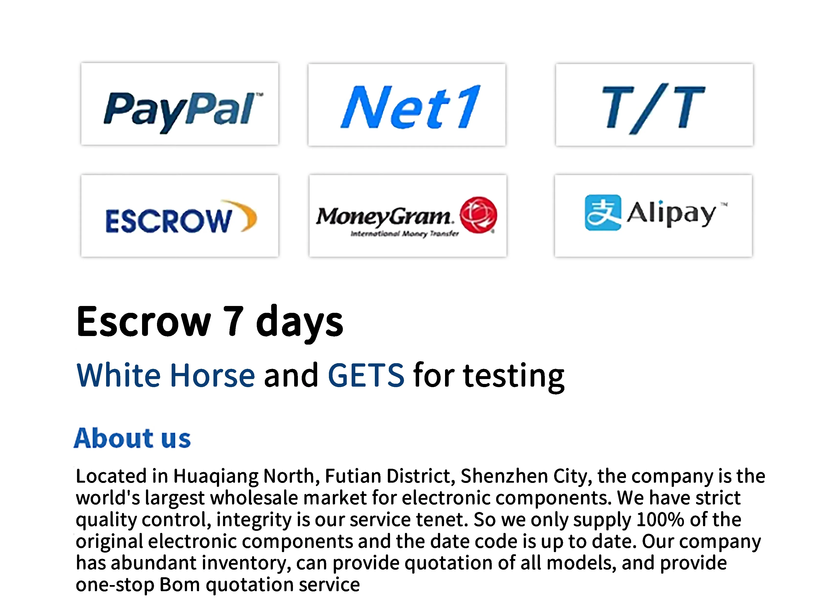 Glad to learn you're on the market of electronic products products. Our company has 170 employees, more than 1,000 square meters of product warehouse, more than ten years of experience in electronic components, good supply channels in chips, more than 2000 stable customers in the mainland, only one hour away from the port of Shenzhen. this is how we keep good quality and competitive prices for global valued customers.