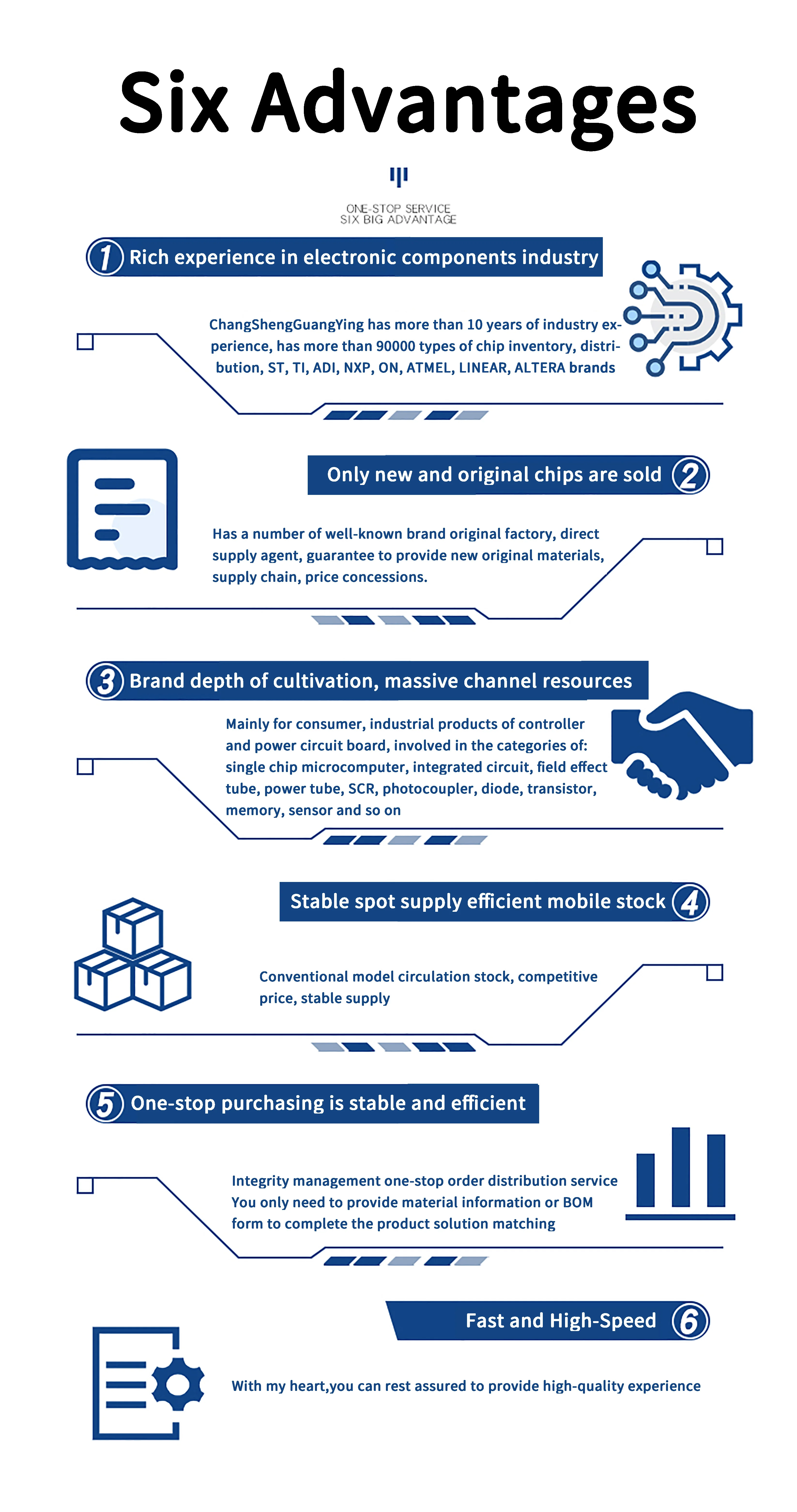 Our main products include:transistor, IC, diode, bridge rectifier,capacitor, LED,connectors, hall element , silicon controlled etc