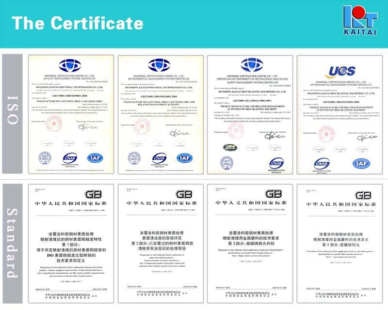 In accordance with standards of GB/T18838.3-2008 Steel Shot and Steel Grit,SFSA20-66Cast Steel Abrasive, SAE J827 Cast Steel Shot, SAE J1993High Carbon Steel Grit, YB/T5149-1993 Cast Steel Shot, YB/T5150-1993Cast Steel Grit,ISO11124-3High Carbon Cast Steel Shot and Grit.