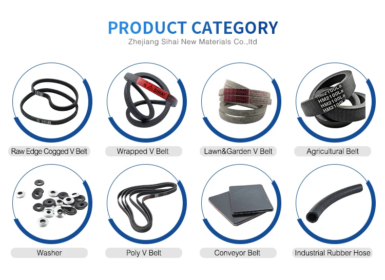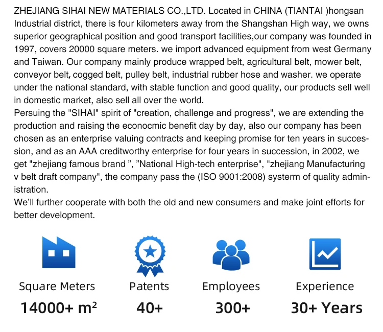 ZHEJIANG SIHAI NEW MATERIALS CO.,LTD . Located in CHINA (TIANTAI )hongsan Industrial district,there is four kilometers away from the Shangshan High way,we owns superior geographical position and good transport facilities,our company was founded in 1997,covers 20000 square meters.we import advanced equipment from west Germany and Taiwan.Our company mainly produce wrapped belt ,agricultural belt , mower belt,conveyor belt ,cogged belt ,pulley belt ,industrial rubber hose and washer .we operate under the national standard,with stable function and good quality,our products sell well in domestic market,also sell all over the world.