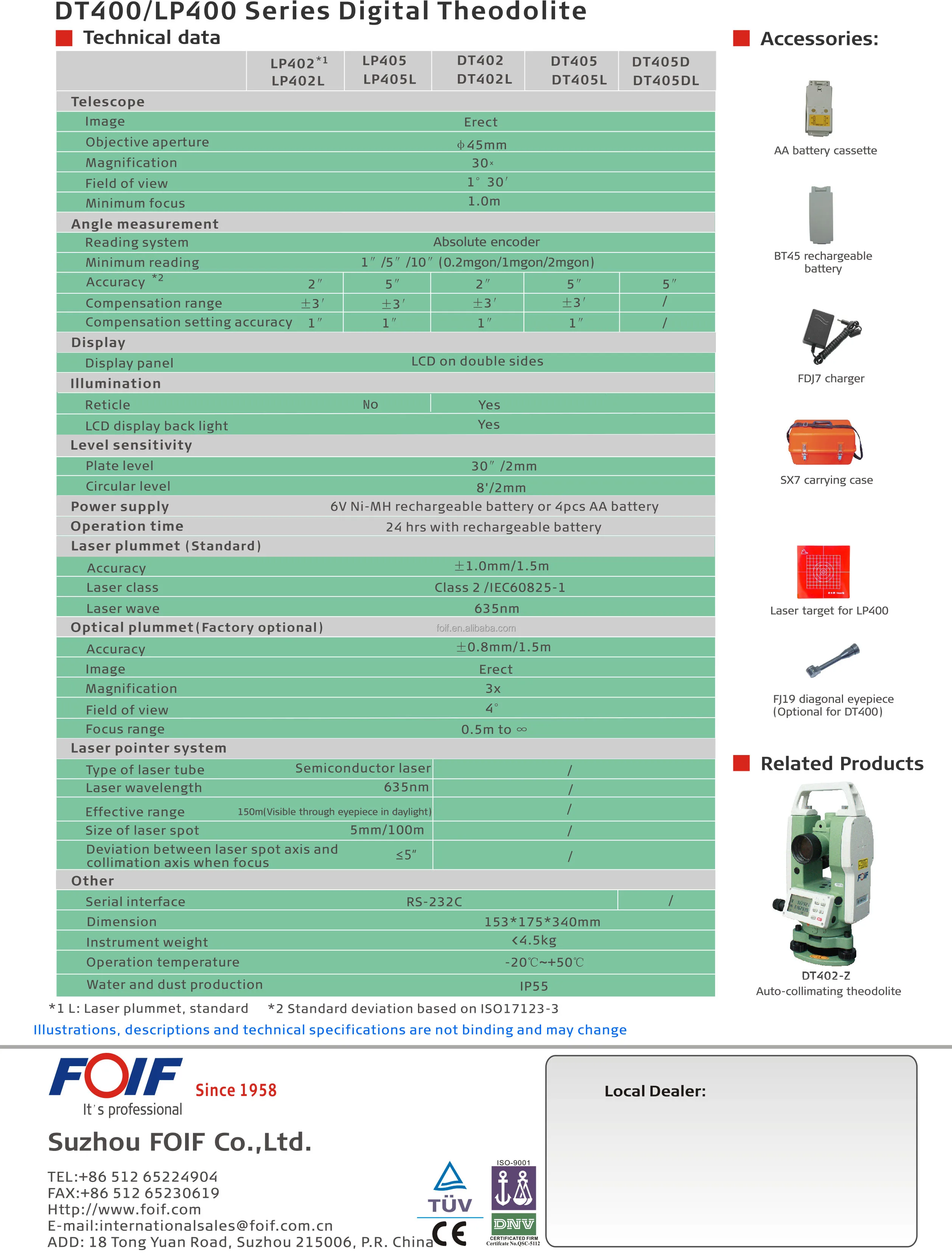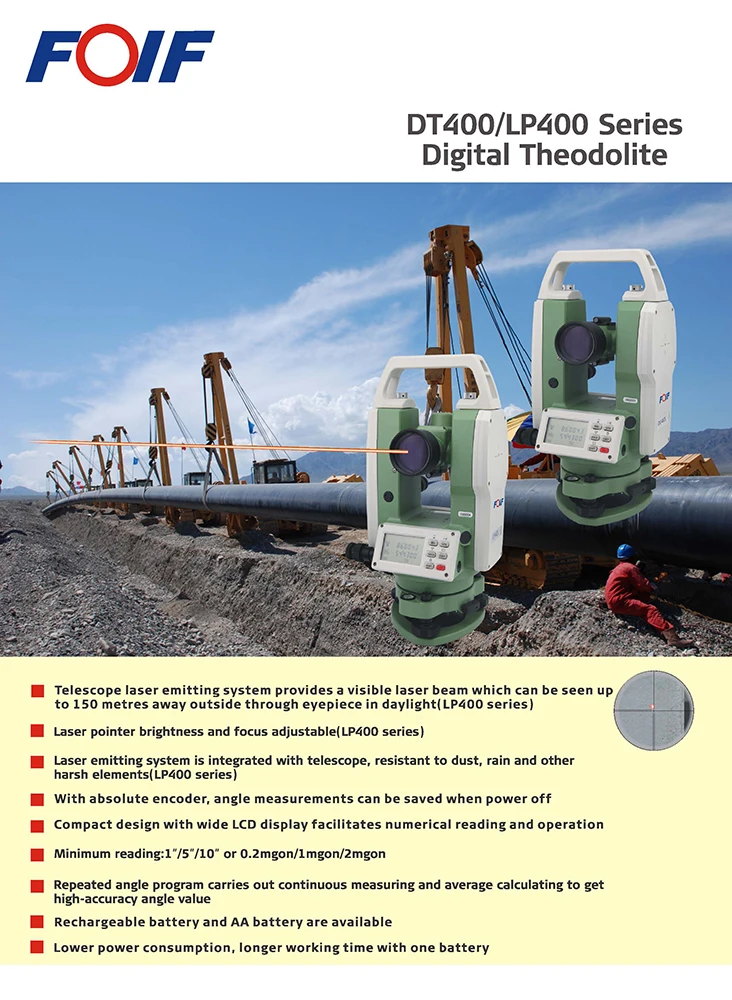 LP402L is the Digital Theodolite with laser pointer function. It can provide an adjustable laser beam which can be seen up to 150m away through eyepiece in daylight. The laser emitting system is integrated with telescope, resistant to dust, rain and other harsh elements. Repeated angle program carries out continuous measuring and average calculating to get high-accuracy angle value. It has lower power consumption and longer working time with one battery.