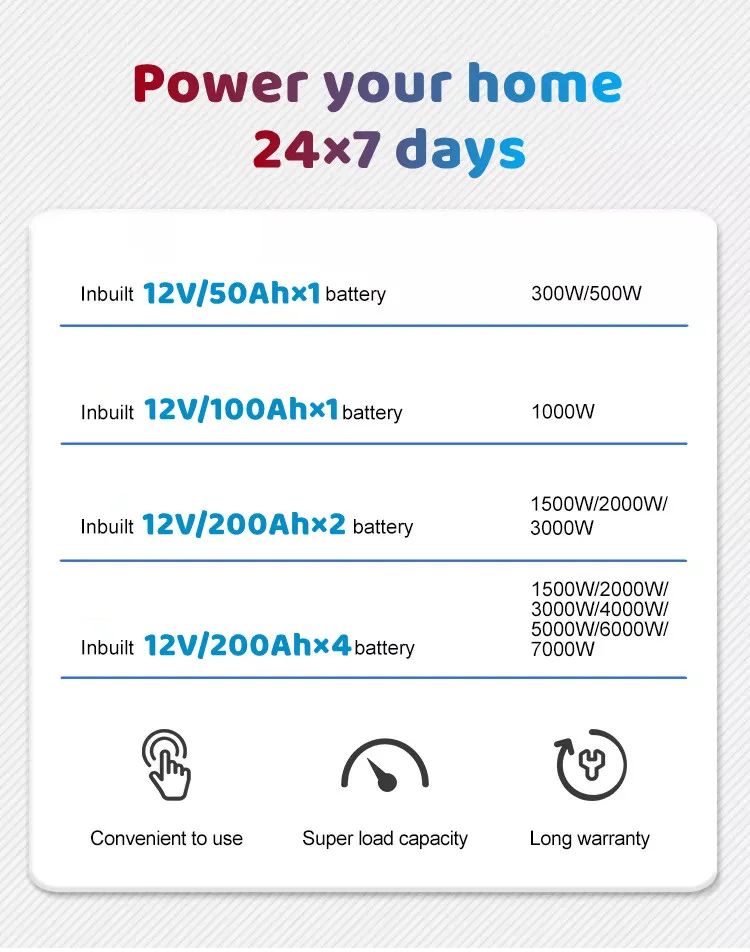 Capacity | Rated power | 1500W | 2000W | 3000W | 4000W | 5000W | 6000W | 7000W | ||||||