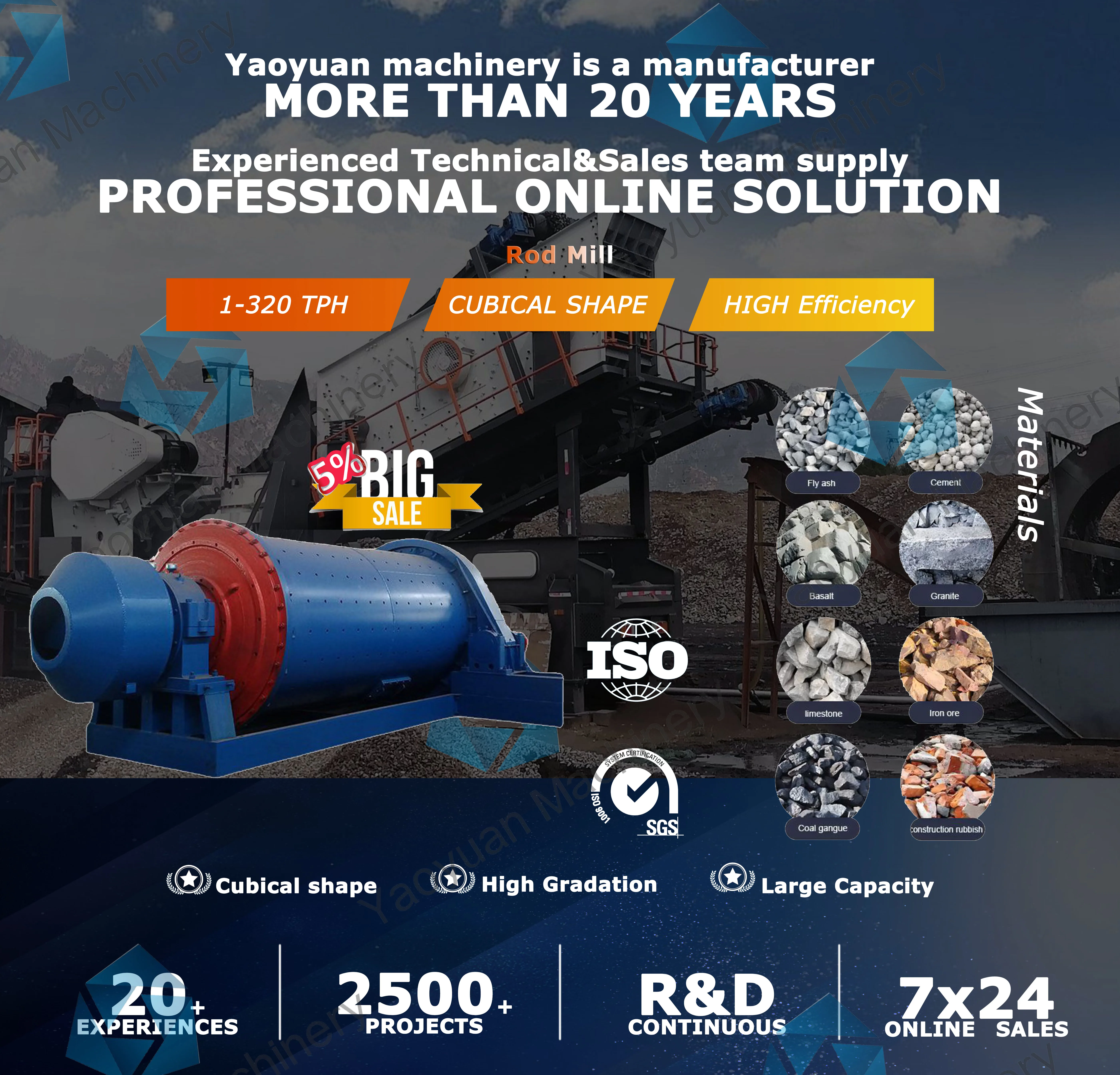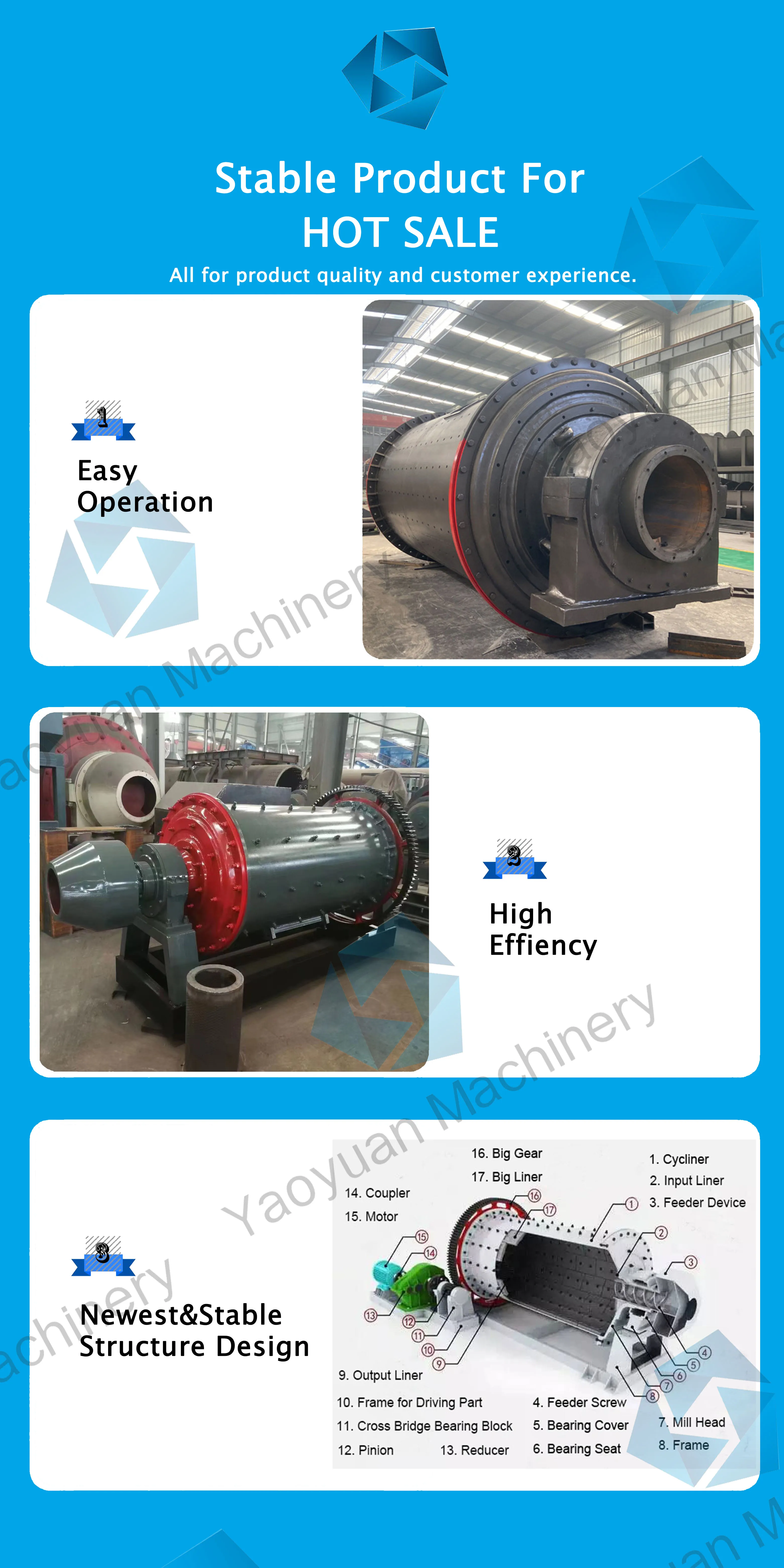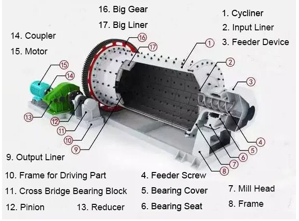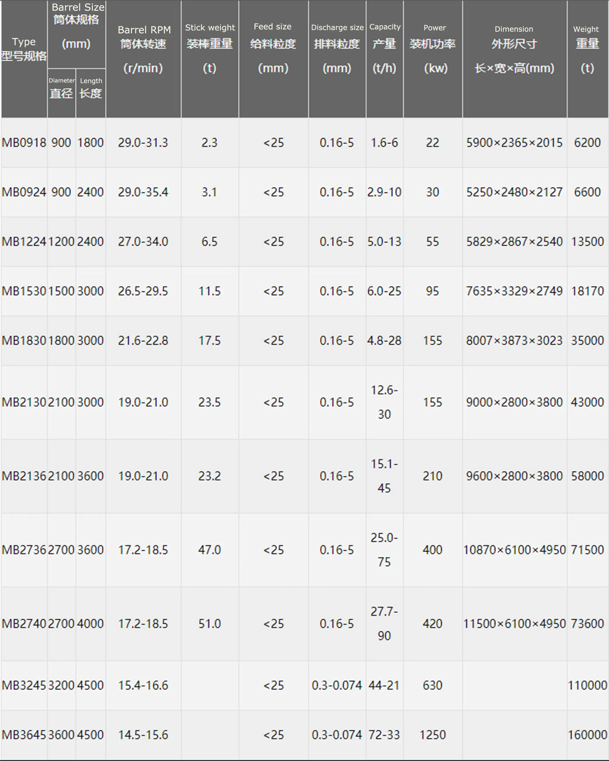 The rod mill is driven by the motor through the reducer and the peripheral big gear reducer, or the low-speed synchronous motor directly through the peripheral big gear reducer to drive the cylinder to rotate. Proper grinding medium - steel bar is installed in the barrel. Under the action of centrifugal force and friction force, the grinding medium is lifted to a certain height and falls down in a throwing or discharging state. The material to be milled continuously enters the cylinder from the ore feeding mouth, is crushed by the moving grinding medium, and the product is discharged out of the machine through the overflow and continuous ore feeding force for the next process.
