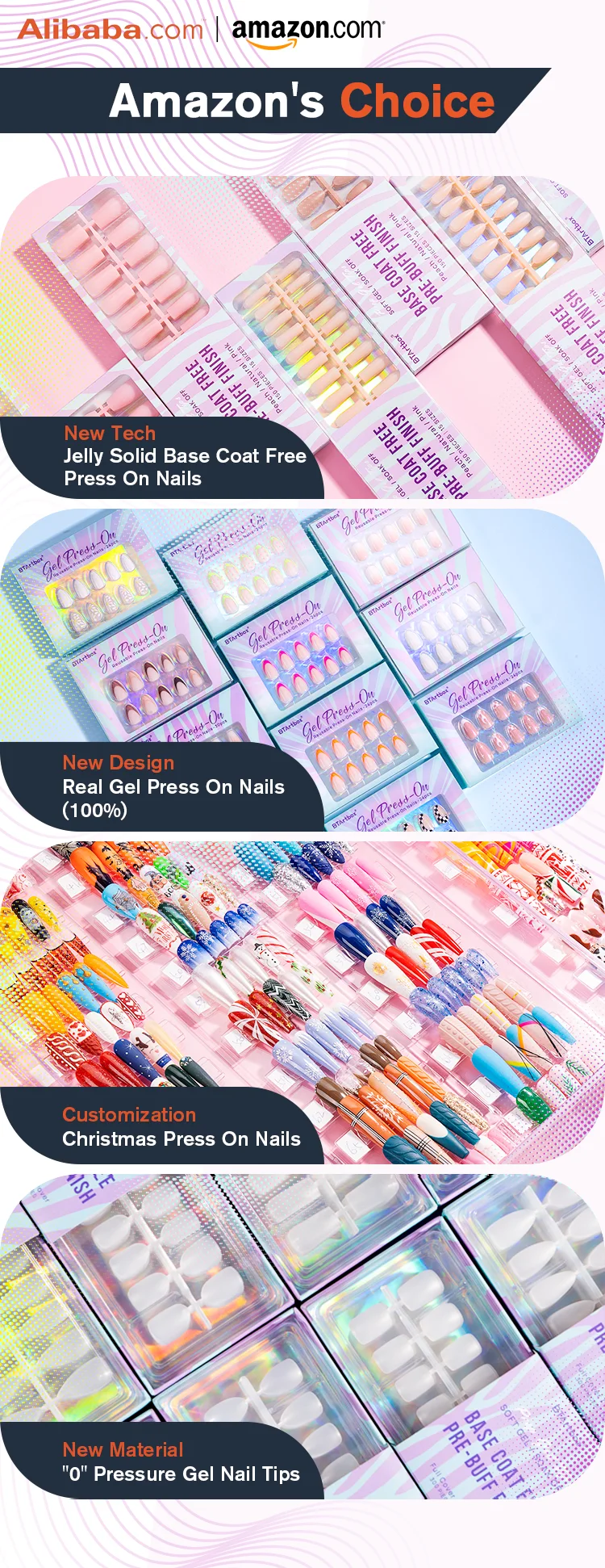 All kinds of Salon Nail Tips(we are model factory and own over 100+ shapes models), Multi designs of press on nails(we have over 10+ production lines);Gel Nail Polish.