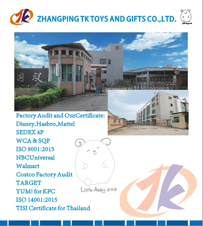 ZhangPing TK Toys & Gifts Co.,Ltd. was established in August 2006 and specialized in developing, manufacturing and exporting of plastic toys, Pet Toys, promotional toys ,candy toys, stationery, gifts, premiums and plastic products.We are located in Zhangping city, Fujian province, China and our company-owned plants covers an area of 90,000 square meters. There are 33 total new injection machines and 25 assembly lines available.We have more than 750 employees and realized the annual sales volume of USD15,000,000, ranking the second in Fujian toy export industry in recent 10 years.With the standard plant buildings and management system guided by EU norm,our company has been certified against a variety of social accountability and quality standards by international reputable companies such as Disney, Universal, Hasbro and Mattel.And We have also passed the standard of Sedex 4P, NBCUniversal, Walmart, Target, GMP of Costco, Yum of KFC,ISO9001:2015 and ISO14001:2015....