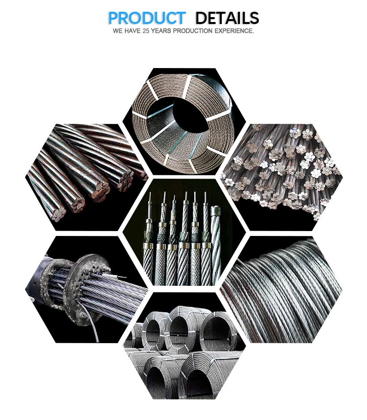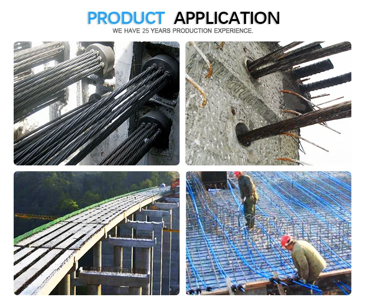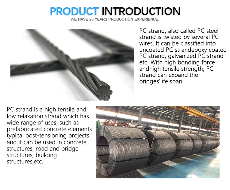 Application | PC Strands are mainly used in prestressed concrete structure reinforcement, such as large-span bridges on railway and highway, overhead crane beam, rock-soil anchoring project, multi-storey industrial buildings, stadiums, coal mines, etc. |