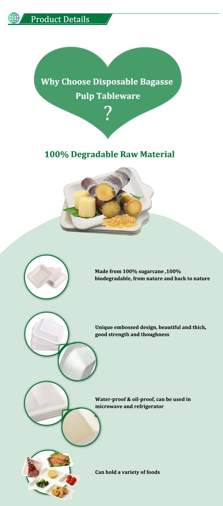 Material | Sugarcane Pulp, 100% Biodegradable and Compostable |