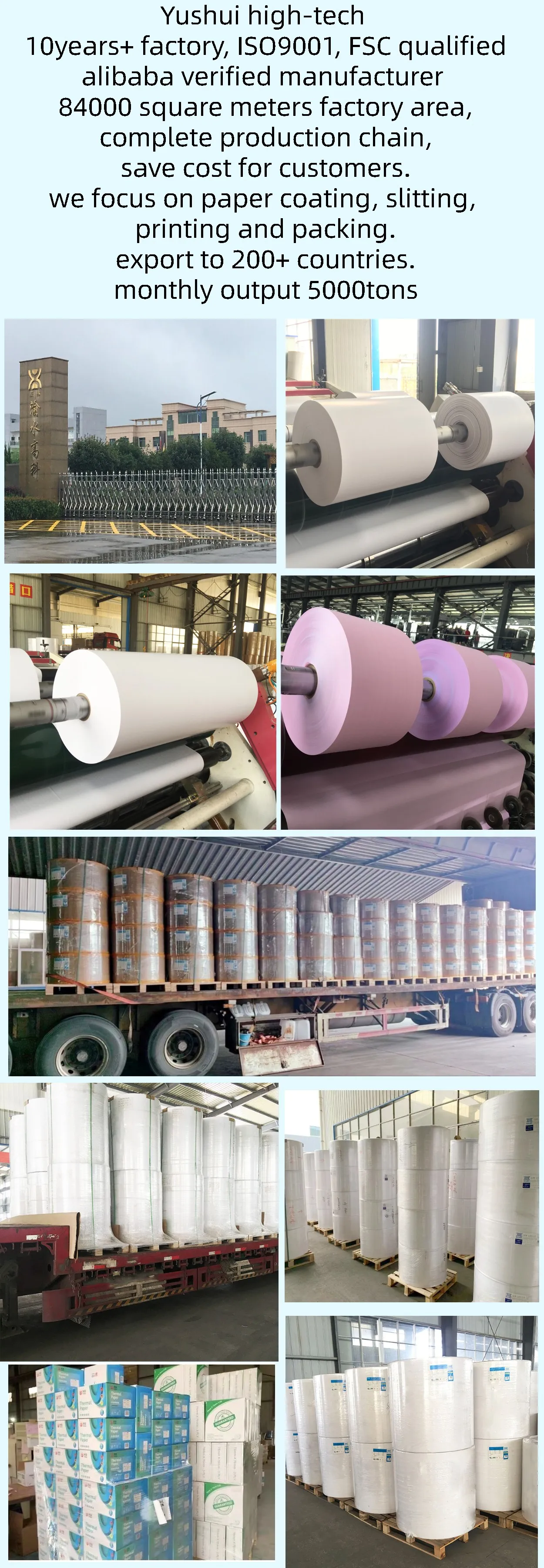 2.We have complete production chain and process, which we focus on paper coating, slitting, printing and packing, while other factory only have paper slitting and packing.
