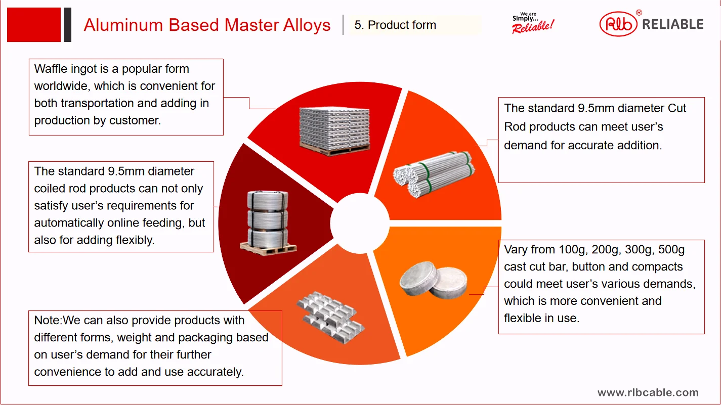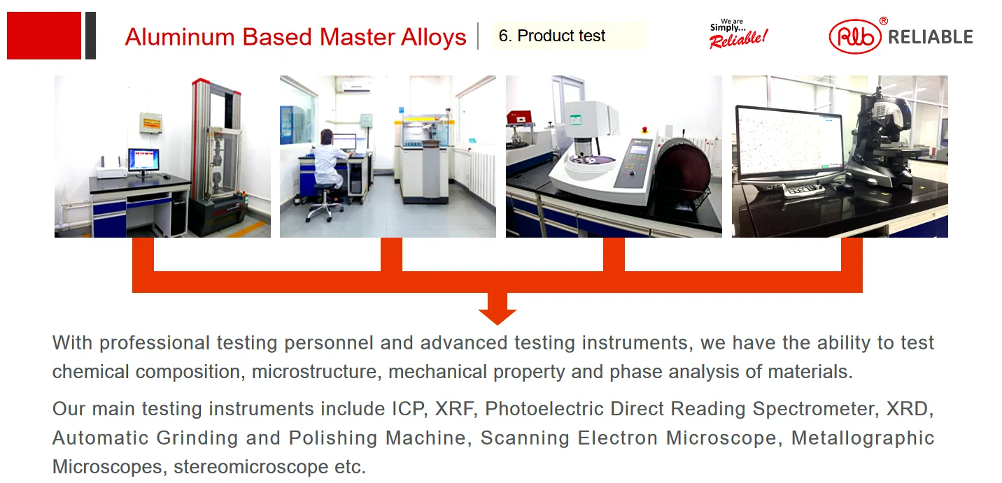 Aluminium rare earth alloy | Al-Re | Improve the corrosion resistance and heat resistant strength of the alloy | After the completion of refining, put into 730ºC molten aluminium |
