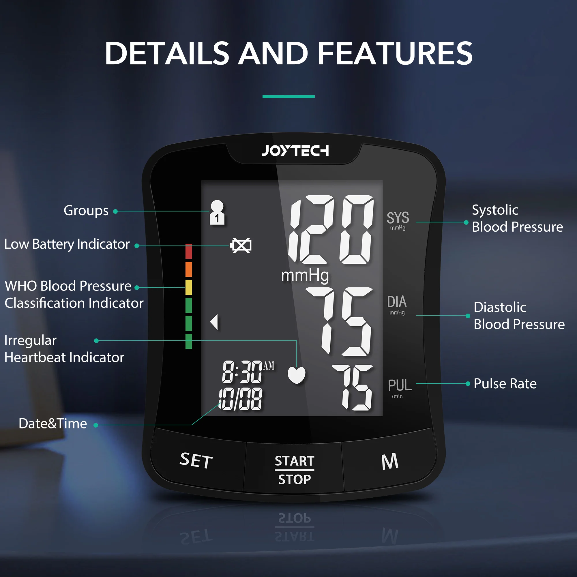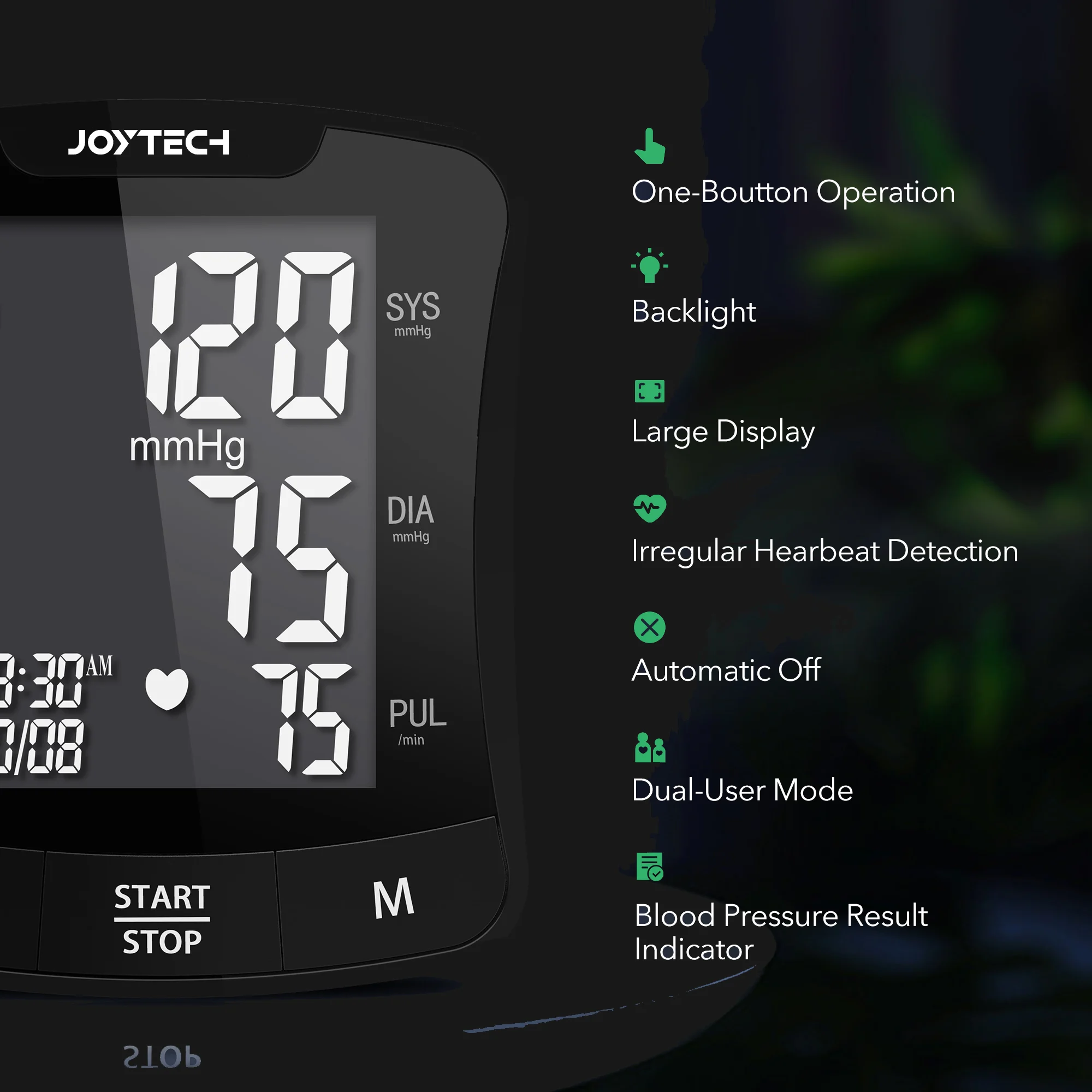 1, IHB Detec, 2, Average Last 3 results, 3, low battary detection, 4, automatioc power-off, 5, blood pressure result indicator, 6, date/time. Optional Functional Talking, backlight, | |||||
