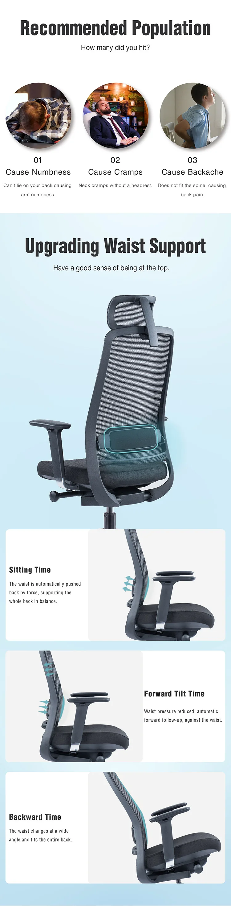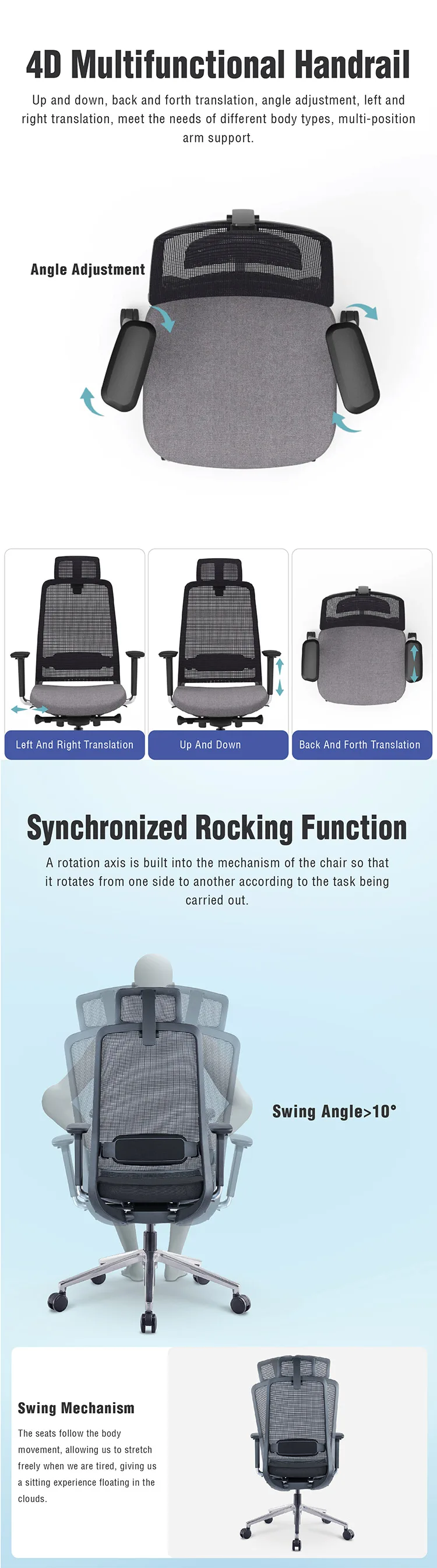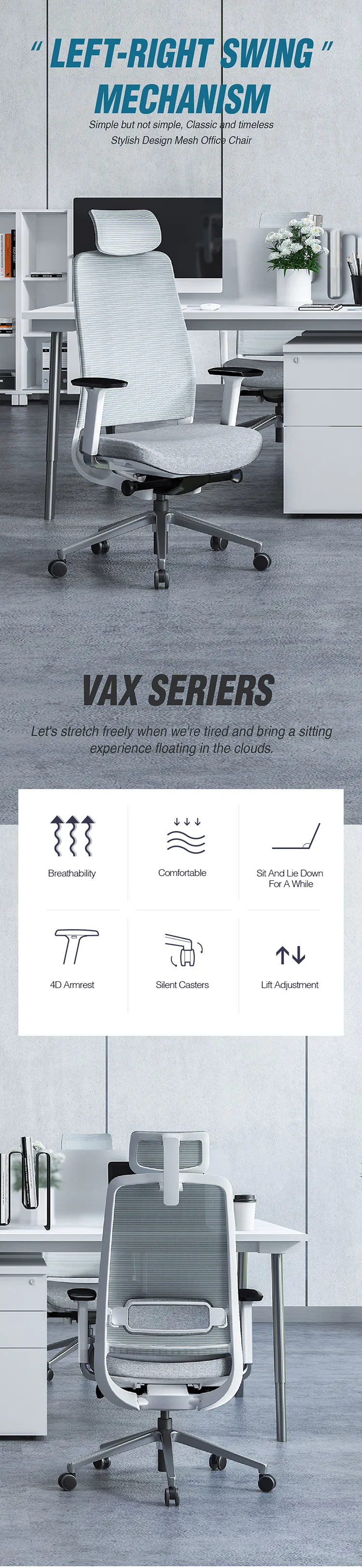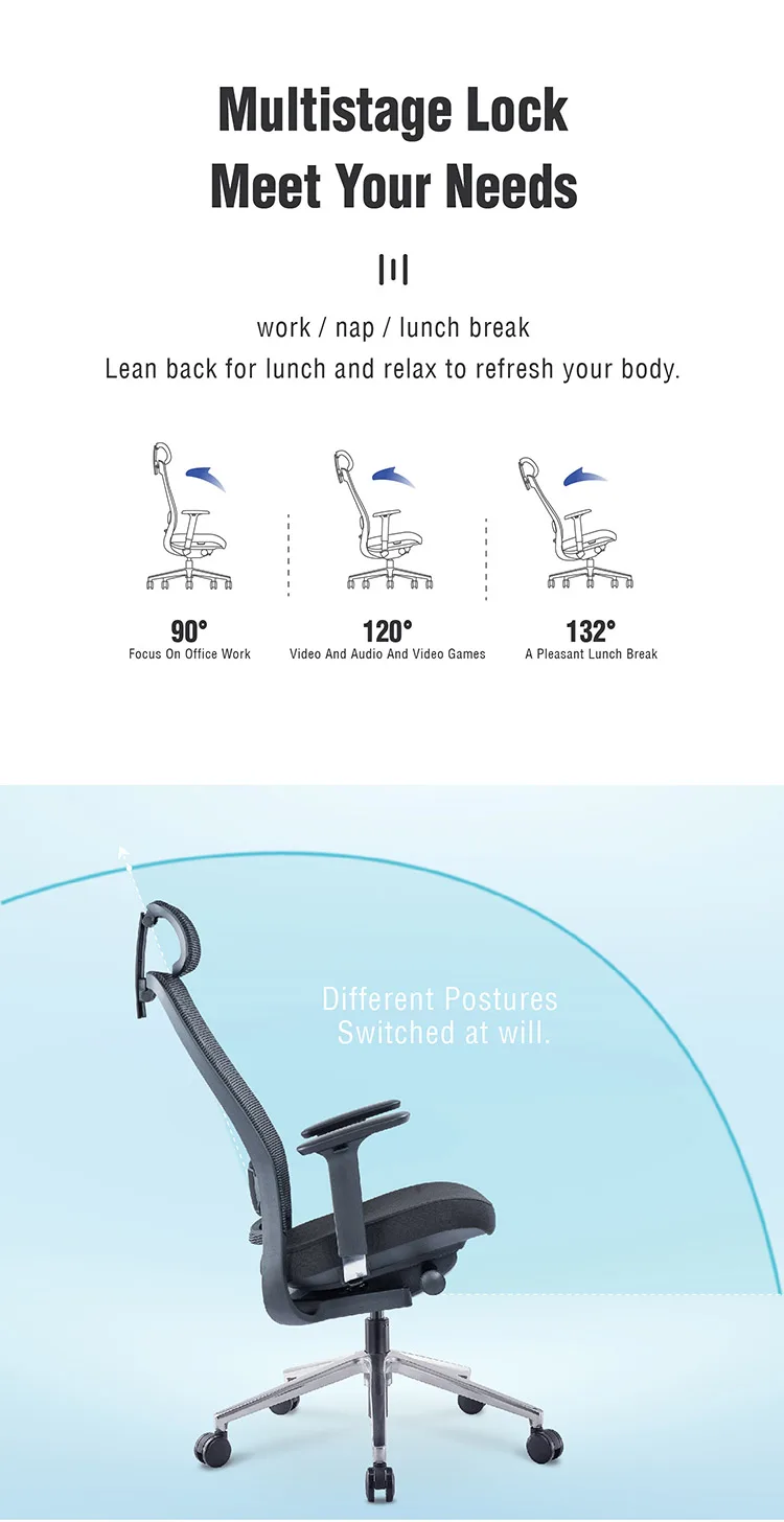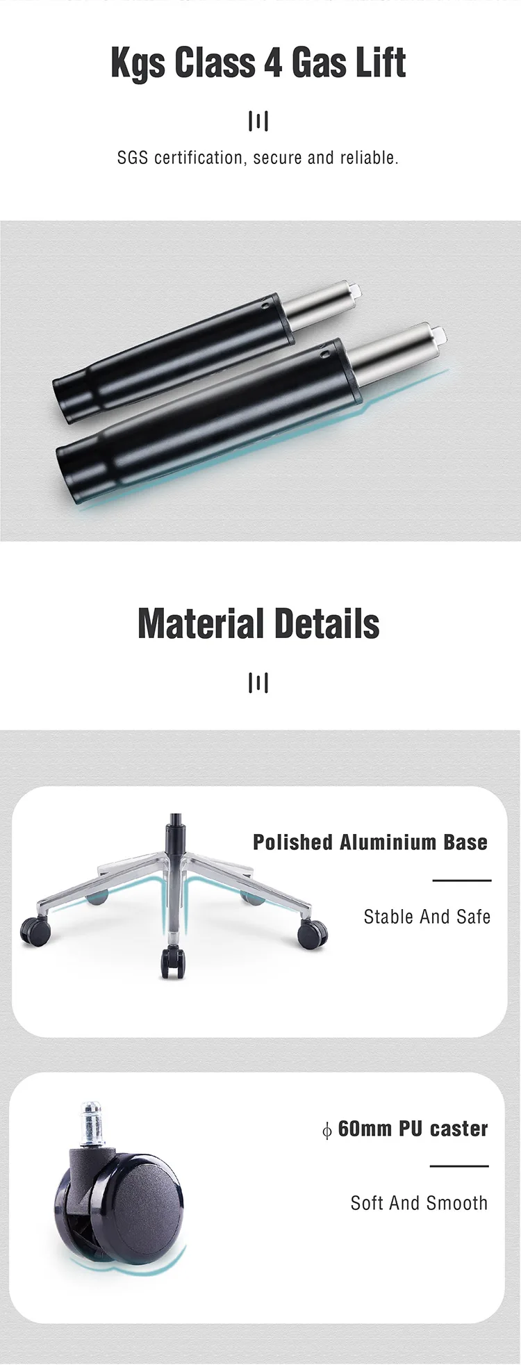 Product description | 1) High back office swivel chair with headrest; 2) Mesh/fabric back ,mould sponge seat with fabric; 3) DONATI Synchronized mechanism;sliding seating 4) polished aluminum base 5) KGS gaslift,Φ60mm PU caster |