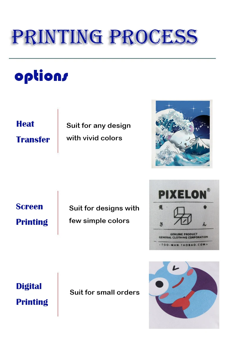 Printing | heat transfer printing, screen printing, digital printing, embodery, etc. |