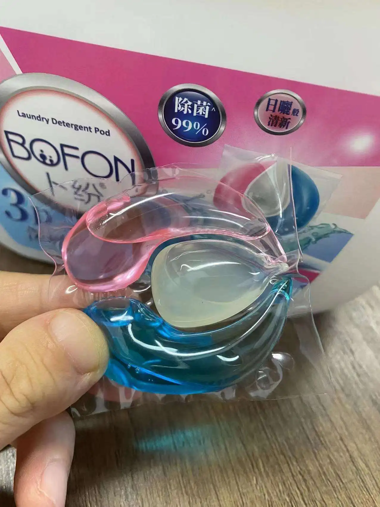 2. Denmark imported protease, strong stain removal, 1 pod can wash 1 large bucket of dirty clothes, 8g pod can wash 8-10 clothes,12g pod can wash 14-18 clothes, 15g pod can wash 20-25 clothes. 3. Antibacterial 99%, dry and not easy to mold. 4. Japan imported water soluble film, water soluble fast, no residue.