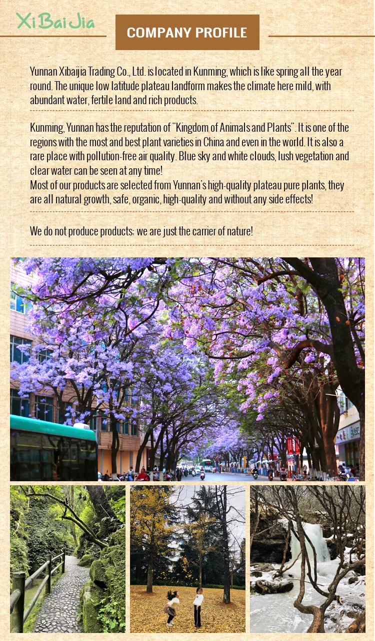 Yunnan Xibaijia Trading Co., Ltd. is located in Kunming, which is like spring all the year round. The unique low latitude plateau