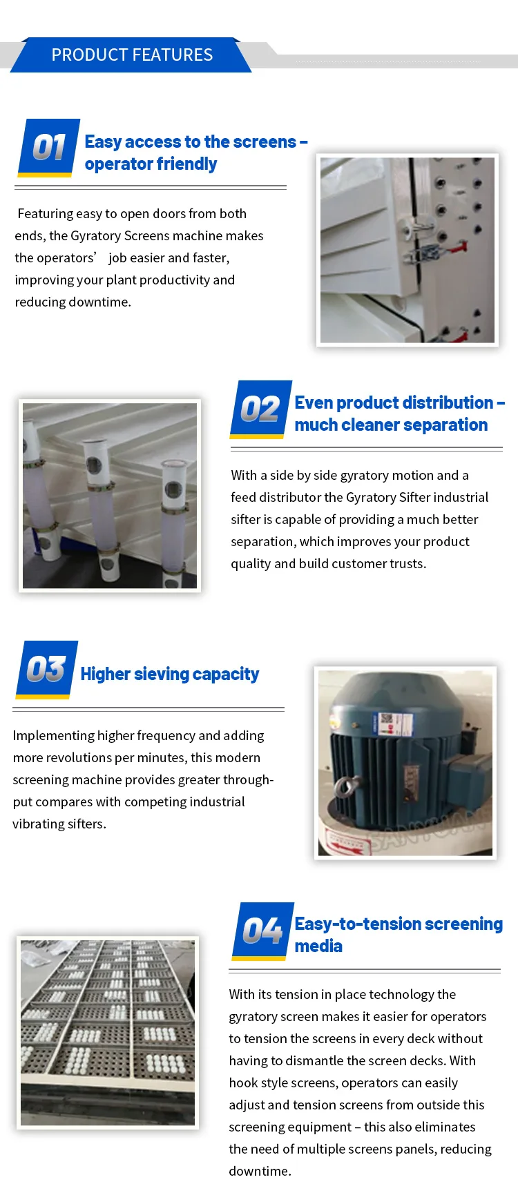 The proper selection of the gyratory sifter depends on the material, number of layers, every mesh size, capacity, material,moisture, viscous and corrosive etc: