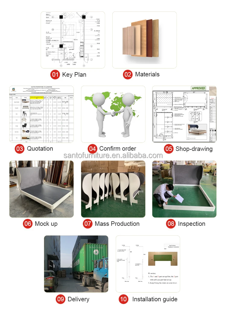 eadboard | king/queen/full/single | 1. wooden frame: solid polished & fumigated hard wooden frame 2. inner core: E0 & E1 plywood, MDF, HDF etc. 3.Surface: veneer, melamine, laminate etc. 4. Coating: UV, PVC, NC, AC oil coating, blister. Lacquer: Environmental friendly lacquer (Dabao lacquer) 5. Upholstery: fabric, leather + foam 6. hardware: soft, all brands |