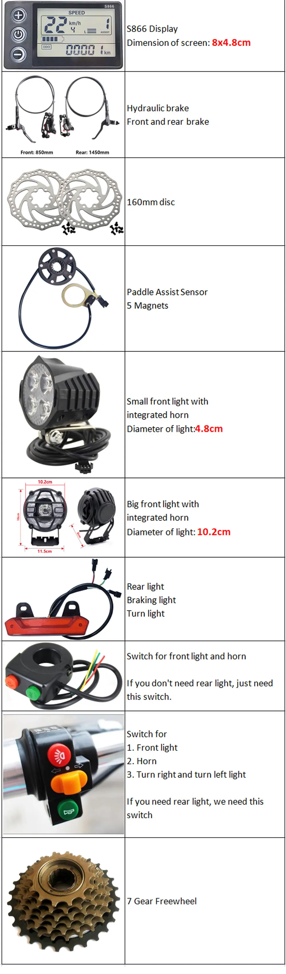 Front Light, Rear Turn Light, Switch for Light and Horn