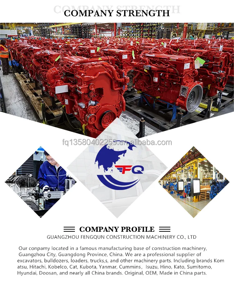 Located in famous manufacturing base of construction machinery, Guangzhou City, Guandong Province, China. We are a professional supplier of excavator, bulldozer, loader, truck and other machinery parts. Including brands Komatsu, Hitachi, Kobelco, CAT, Kubota, Yanmar,Cummins,Isuzu, Hino,Kato, Sumitomo,Hyundai, Doosan and nearly all China brands. Original, OEM, Made in China parts. Main products are as follows: