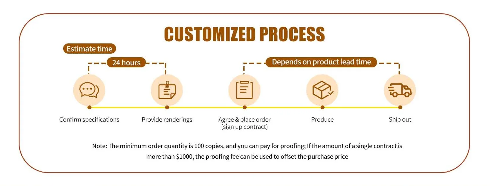 Q: How can I get free custom proofing ?A: Steps to have free custom proofing: 1, chat with me to place an custom proofing order;2, received and agreed with the sample, placed the actual order with payment over $1000, the proofing fee can be used to offset the purchase price.