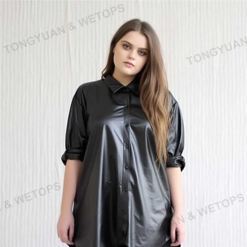 Женская одежда большого размера рубашка Черная Длинная кожаная блузка с запонками женские