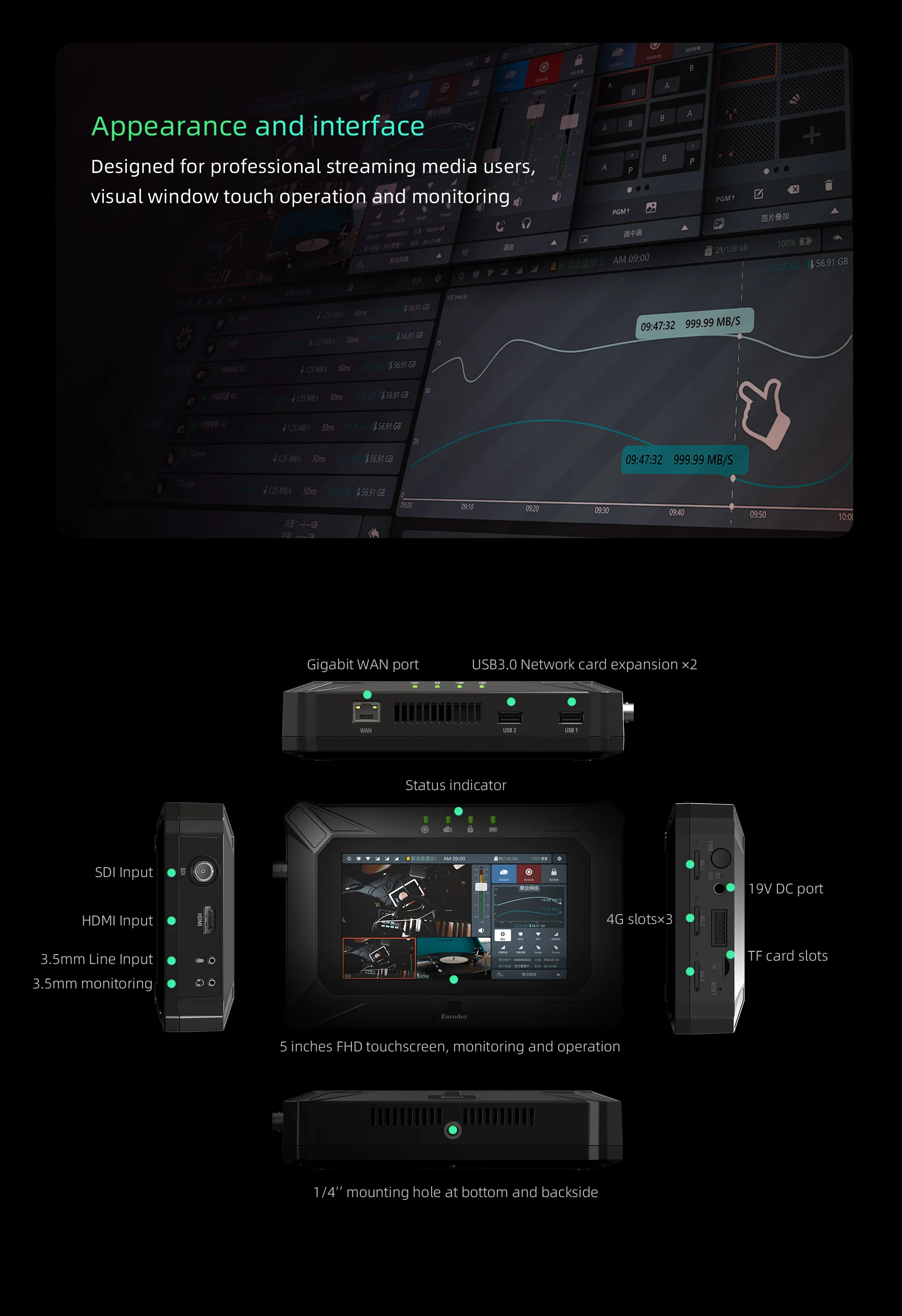 Internet | RJ45 1000M/100M, 4G (3* Sim), WIFI,2*USB3.0,Audio in/out | ||||||