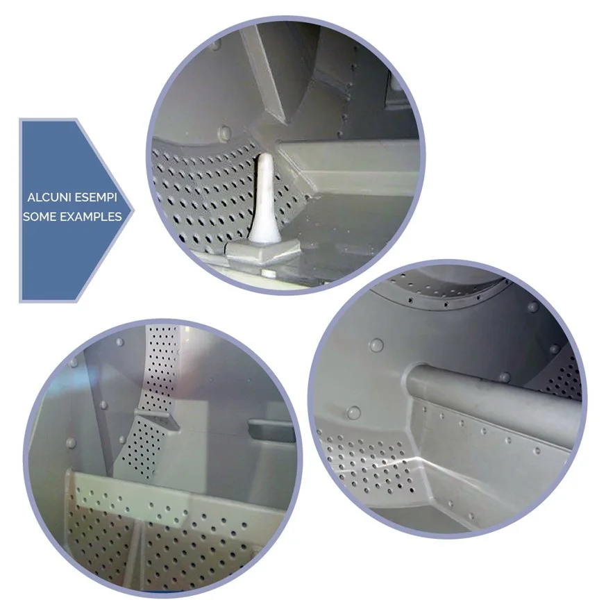 The extremely smooth surface of polypropylene and the possibility of rounding or coating any part inside the drum eliminate any problem of abrasion of the grain of the leather during processing.