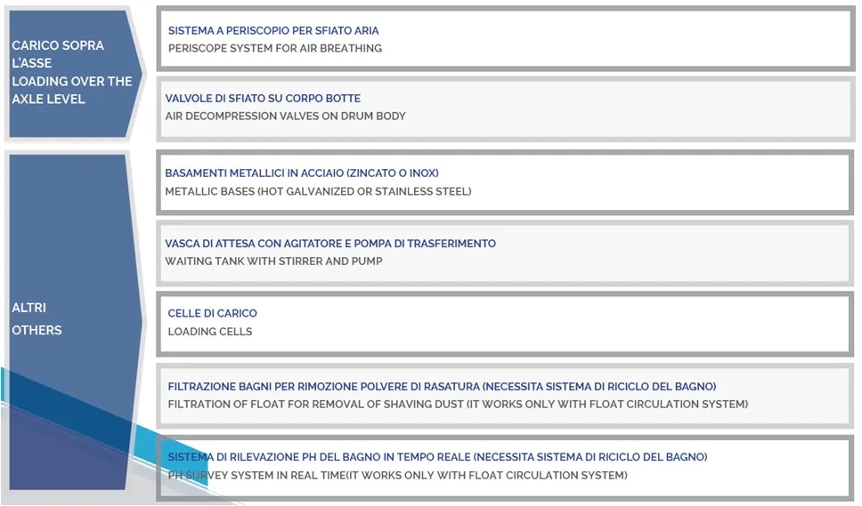 Polypropylene drums can be used in all phases of the tanning process, even those in which more aggressive products are used, or in presence of extreme variations in pH, or with a high risk of contamination. For instance, it is possible to use the same drum both for traditional chrome tanning, and for chrome-free or vegetable processes.
