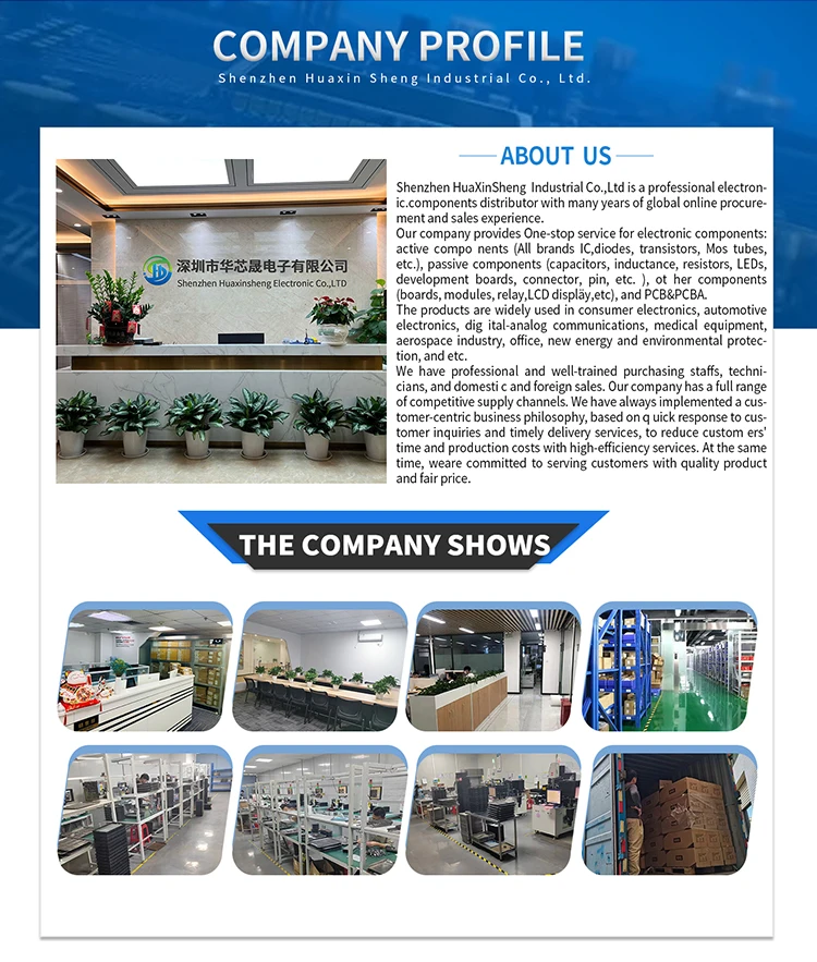 The company provides one-stop service for electronic components: active components (all brands IC, diode, transistor, Mos tube, etc.), passive components (cap capacitor, inductor, resistor, led, development board, connector, pin, etc.), ot components (board, module, relay, LCD display, etc.), PCB&PCBA.