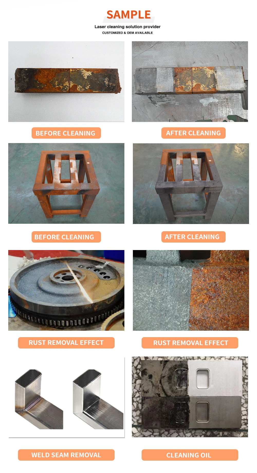 A1: Please let us know the type and thickness of contaminants you need to remove, our sales staff will recommend the most suitable power and configuration for you, and the style supports customization. | ||||||||