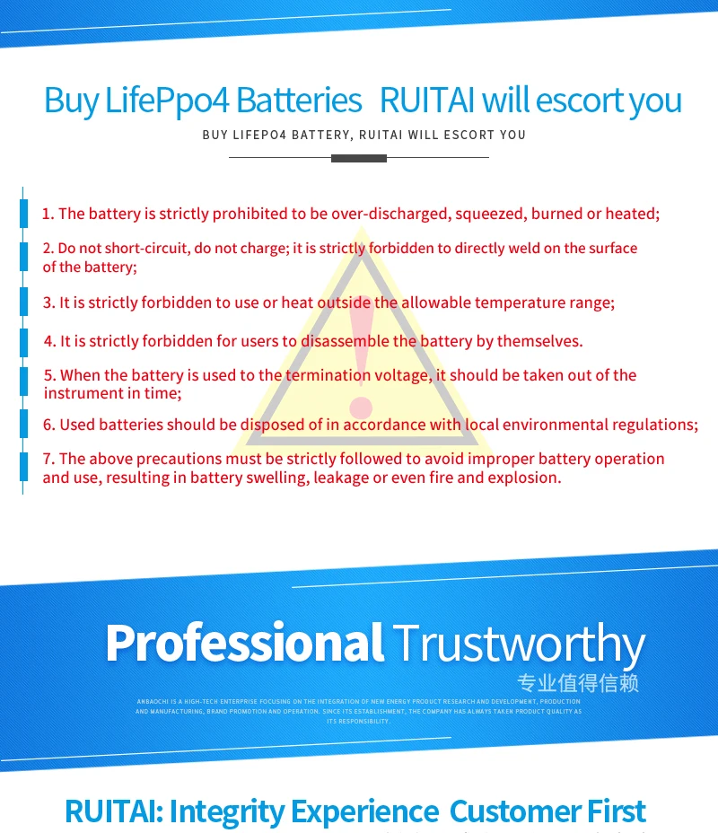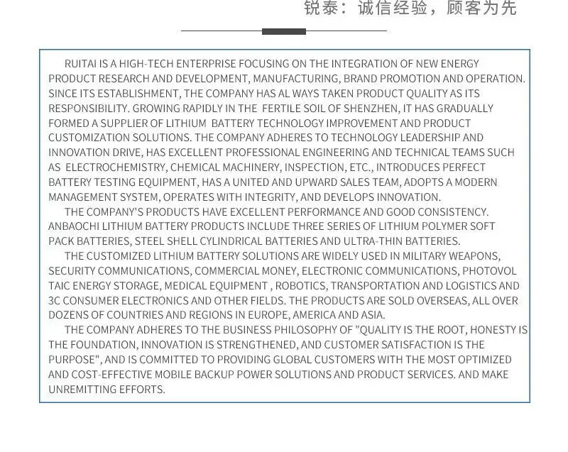 Ruitai is a high-tech enterprise focusing on the integration of r&d, manufacturing, brand promotion and operation of new energy products.Fast growing in shenzhen's fertile soil, it has grown into the world's leading provider of lithium battery and product customization solutions. The company insists on technology leading and innovation driving, has excellent electrochemical, chemical machinery, inspection and other professional engineering and technical team, the introduction of perfect battery testing equipment, has a united and upward sales team, the adoption of modern management system, integrity management, development and innovation.