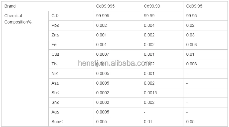 The unit weight is 6kg-8kg.Main features Cadmium metal is easily soluble in acidic media. It is easy to oxidize, and after cadmium oxide protective layer is formed, it will not continue to oxidize.Cadmium has a melting point of 320.9 ° C and a boiling point of 765 ° C. At room temperature, it is very ductile and becomes very brittle at 80 ° C.