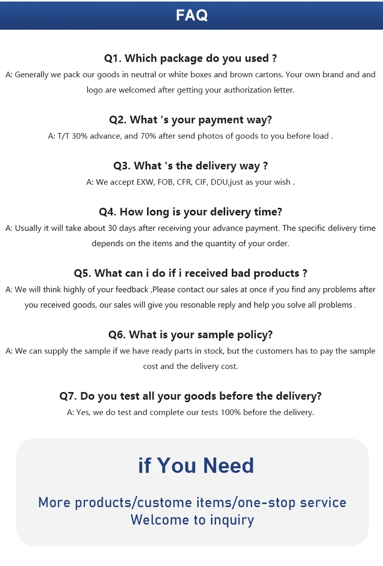 A: We are manufacturer and trading company of auto parts, we have been in this line for more than 15 years.