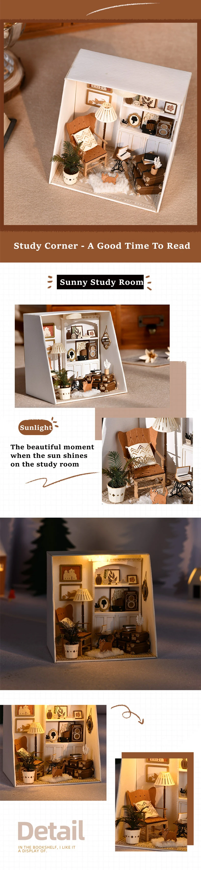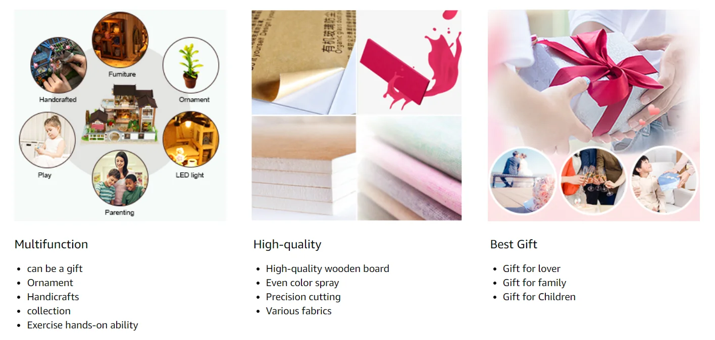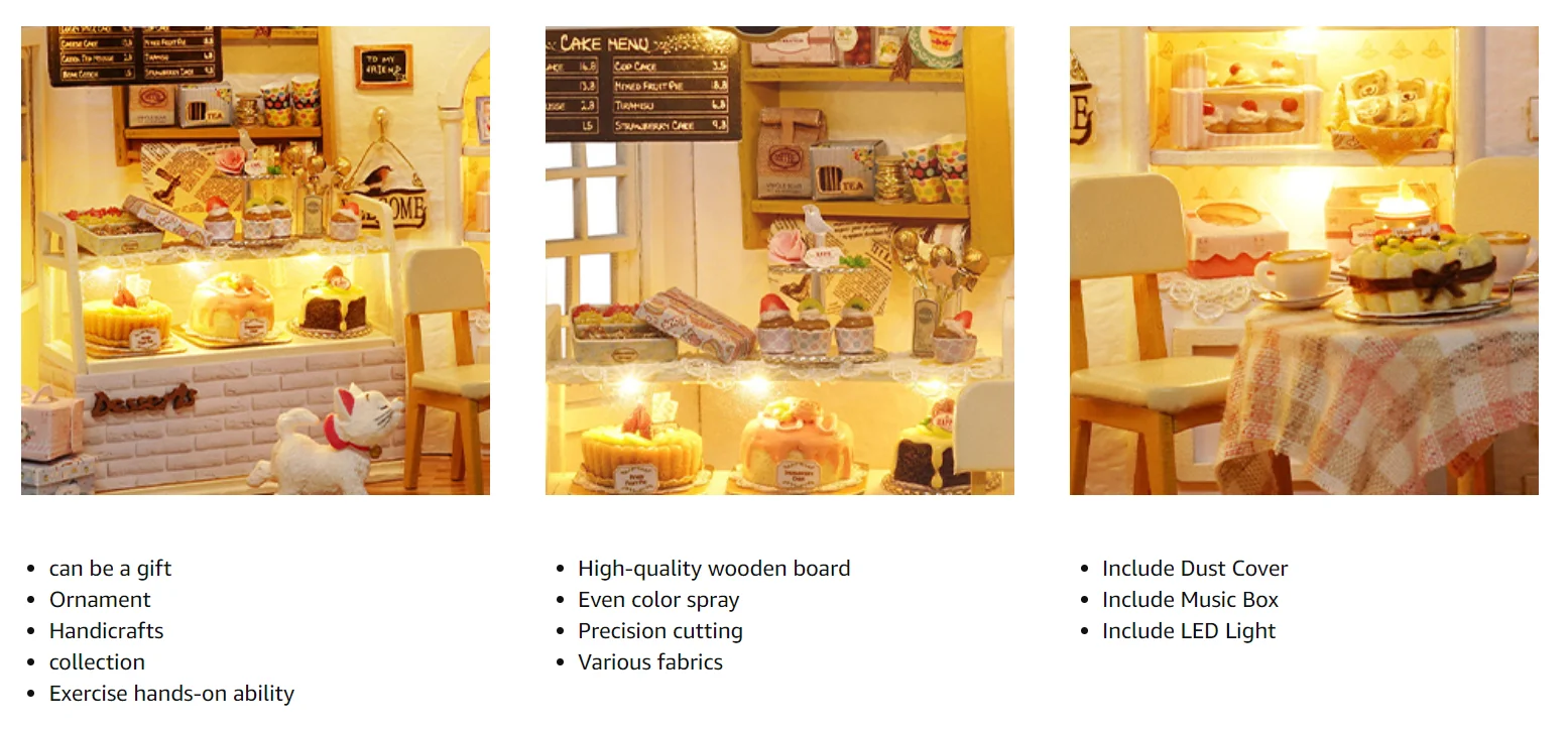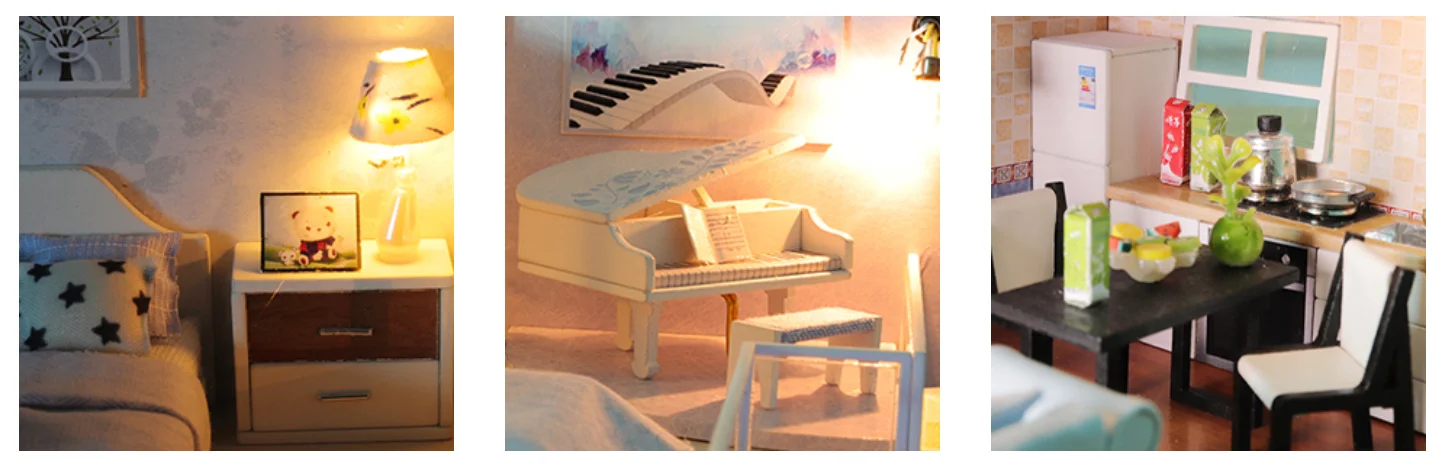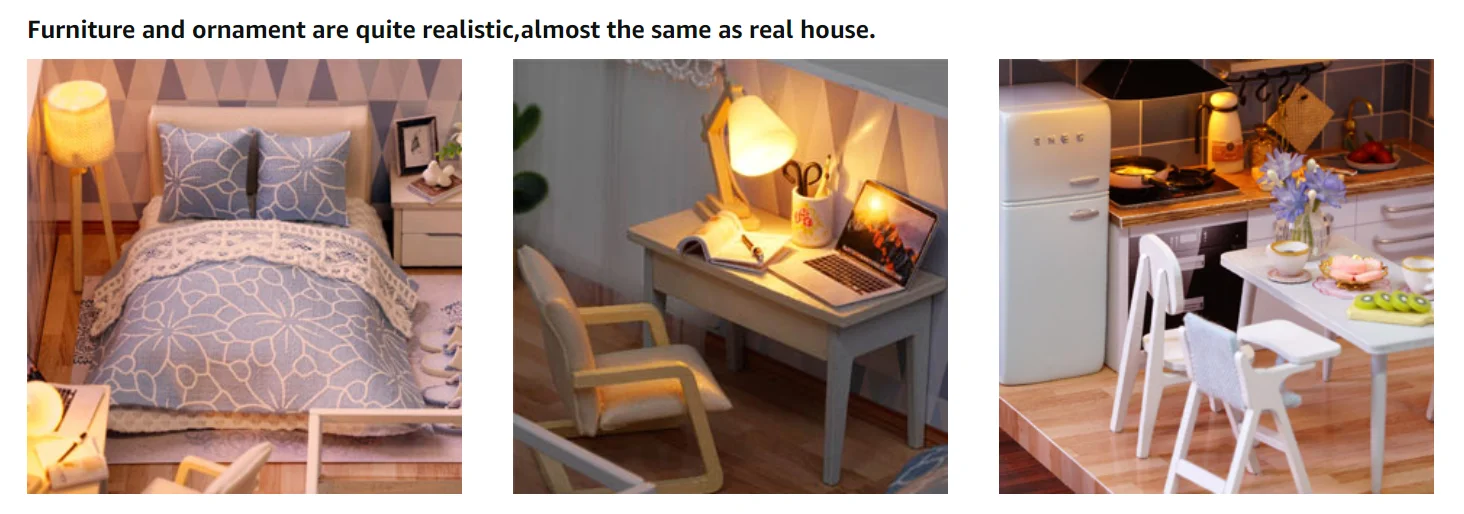 High Quality and Excellent Designed | Materials are of good quality,the furniture and other wooden pieces are precisely cut so that they fit together correctly. LED light,plants, ornament, furniture are quite realistic and cleverly designed. |