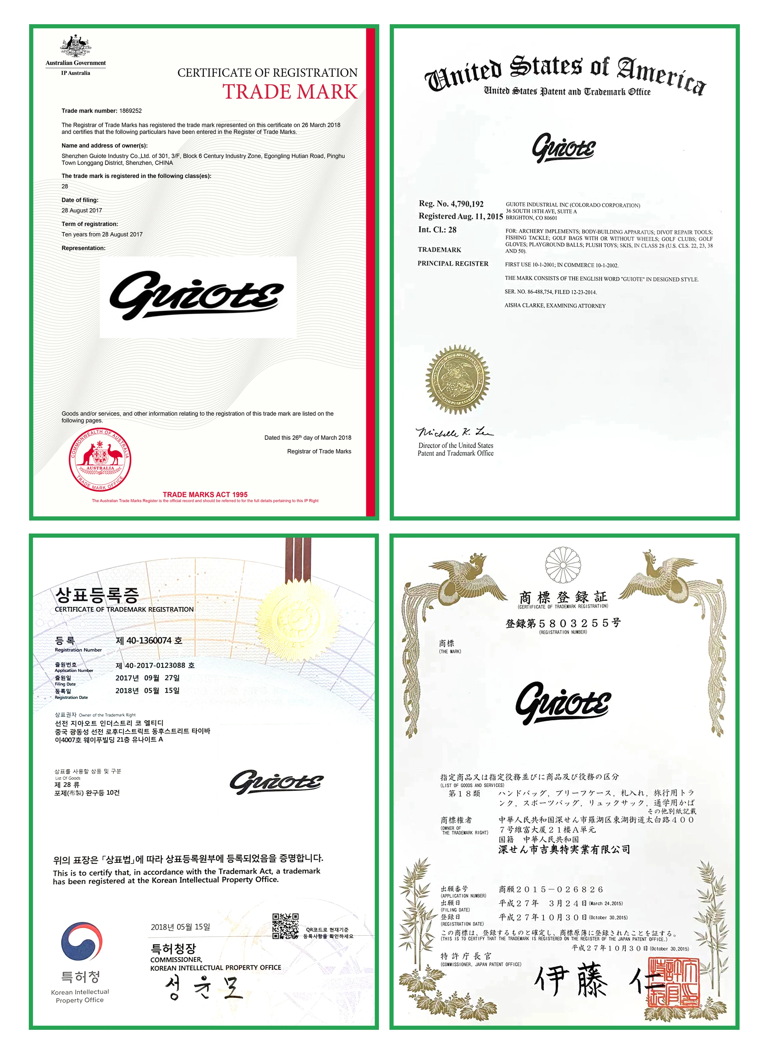 Founded in 2004. Shenzhen Guiote Industrial Co., Ltd. is located in Shenzhen, China.the product base of golf.It is specializes in the design, development, production and sales of various golf headcovers and bag. GUIOTE is the main brand of our company. It has obtained trademark registration certificates from many countries.Our goal is to provide quality service, continuous innovation,to meet the needs of the market and customers,and to provide high quality golf products to all customers.