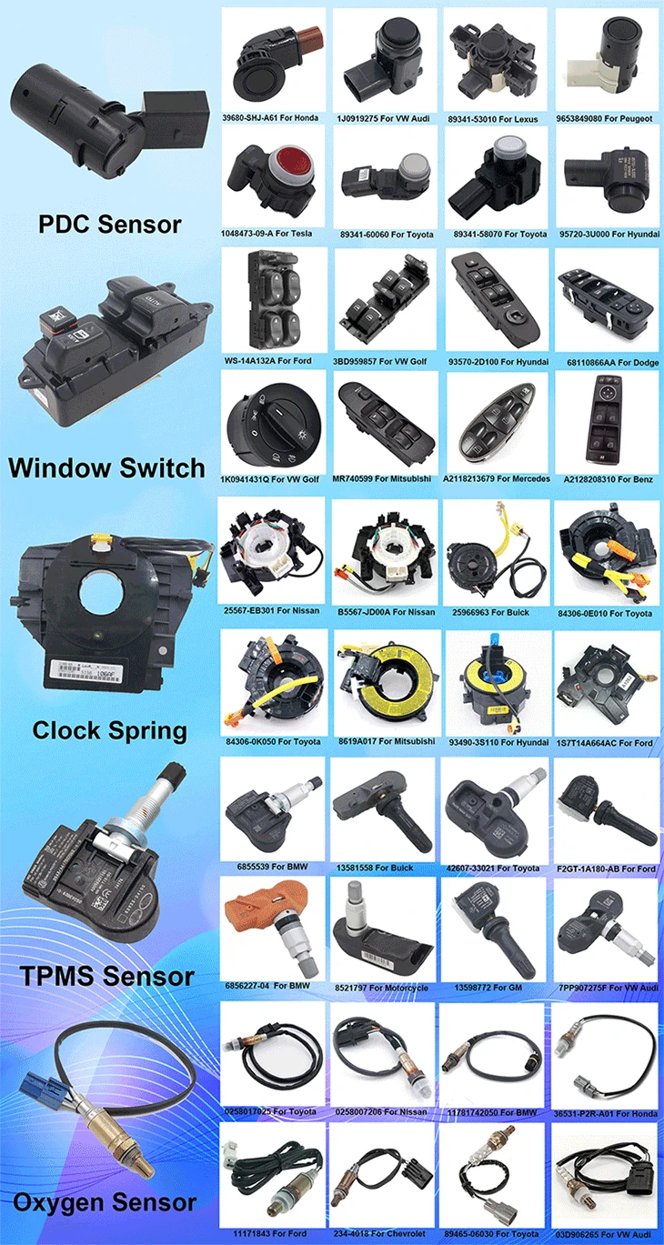 Such as PDC sensor (reversing radar), ABS speed sensor, window switch, oxygen sensor, crankshaft position sensor, Fule rail pressure sensor, fuel injector and so on. Both at domestic and abroad have a very high reputation, all sensors have been sold to about 30 countries and regions in the worldwide.