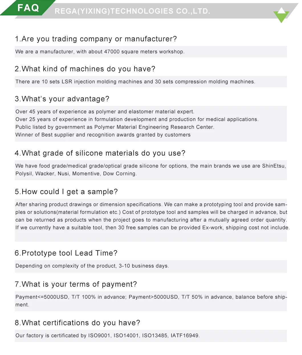WE CAN ACHIEVE all the products with belowing standards: Bio-burden、Cytotoxicity、Out-gassing Drop proof、Oil resistant、Anti weathering Chemical resistant、Bio-compatibility Water proof IP 67, IP68、 Damping properties Liquid Silicone Rubber Injection Molding (LIM) LSR Overmolding to a variety of surfaces ISO 10993-1、 USP Class VI FDA 、ASTM D2000 etc. Customized primer formulation | ||||||||