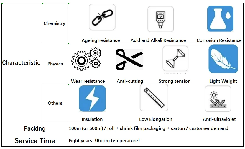 Feature | High strength, high modulus, cut resistance, low elongation at break, high resistance to chemicals and UV, float on water. |