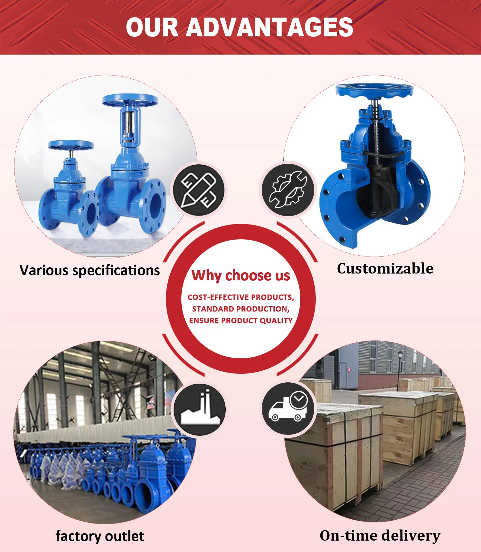 Soft seal gate valve, overcome the general gate valve sealing poor, elastic fatigue, rubber aging and rust and other defects, soft seal gate valve using elastic valve plate to produce a trace of elastic deformation of the complementary taste to achieve good sealing effect, the valve has a light switch, reliable sealing, good elastic memory and long service life and other significant advantages. Can be widely used in water, sewage, construction, petroleum, chemical, food, medicine, light textile, electric power, ships, metallurgy, energy systems and other fluid pipelines as a regulating and intercepting device.
