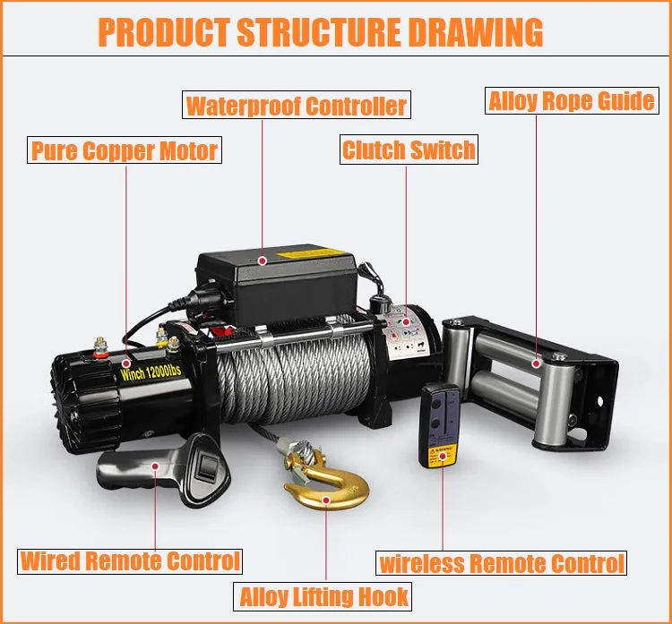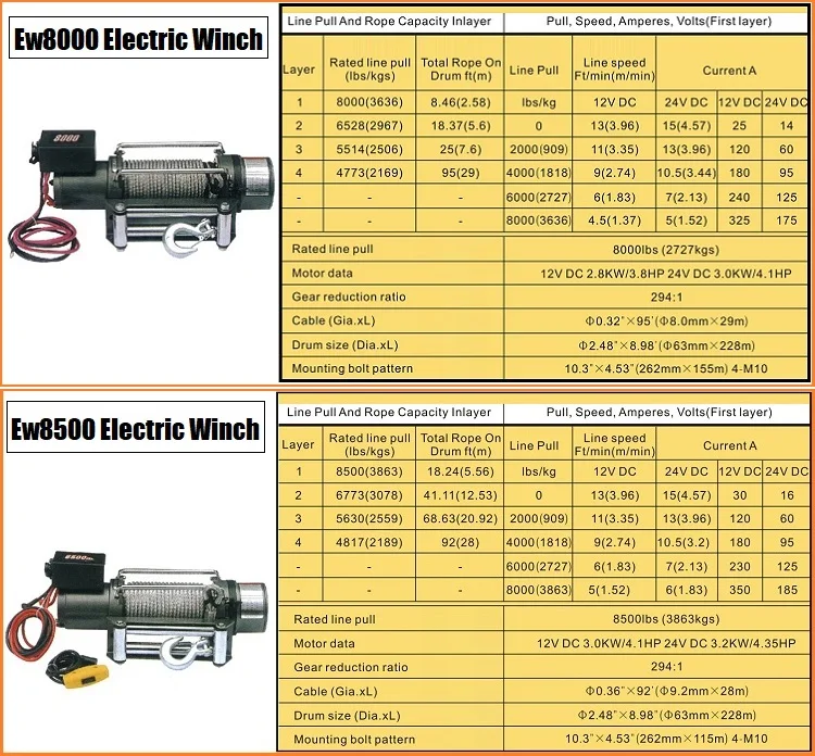 Ew8500 | 8500lbs(3863kgs) | 12V DC 3.0KW/4.1HP 24V DC 3.2KW/4.35HP | 294:1 | Φ9.2mm*28m | Φ63mm*228m |
