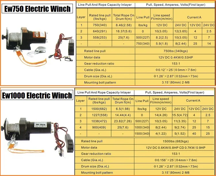 Ew1000 | 1500lbs(682kgs) | 12V DC 0.6KW/0.8HP 24V DC 0.7KW/0.9HP | 153:1 | Φ4mm*7.6m | Φ32mm*73m |
