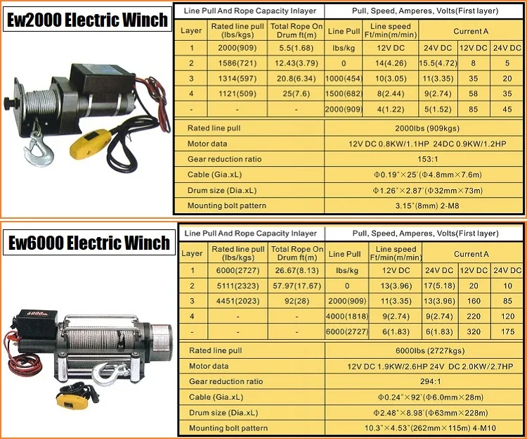 Ew2000 | 2000lbs(909kgs) | 12V DC 0.8KW/1.1HP 24V DC 0.9KW/1.2HP | 153:1 | Φ4.8mm*7.6m | Φ32mm*73m |